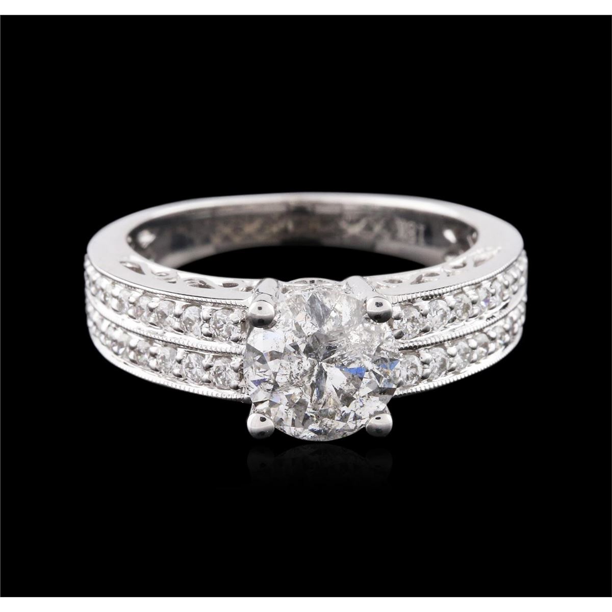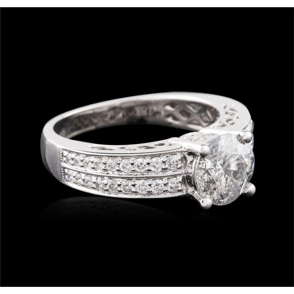 One electronically tested 18KT white gold ladies cast diamond engagement ring with a bright polish finish. Identified with markings of "18K". Condition is new. Containing: One prong set round brilliant cut diamond, measuring 7.50 - 7.50 x 4.50mm (depth est.) approximate weight of 1.54ct. Clarity: I-2. Color: H, Cut is Good. Forty prong set round brilliant cut diamonds, measuring 1.50 - 1.10 x 0.78mm (depth est.) approximate total weight of 40 Stones = 0.32ct. Clarity: SI-2 to I-1. Color: I - J, Cut is Good. All diamonds are graded in the mounting, unless otherwise stated. Total Weight of Diamonds 1.86ct. Total Weight of Engagement Ring 5.90 grams. GGL Appraised at $9,355.00.