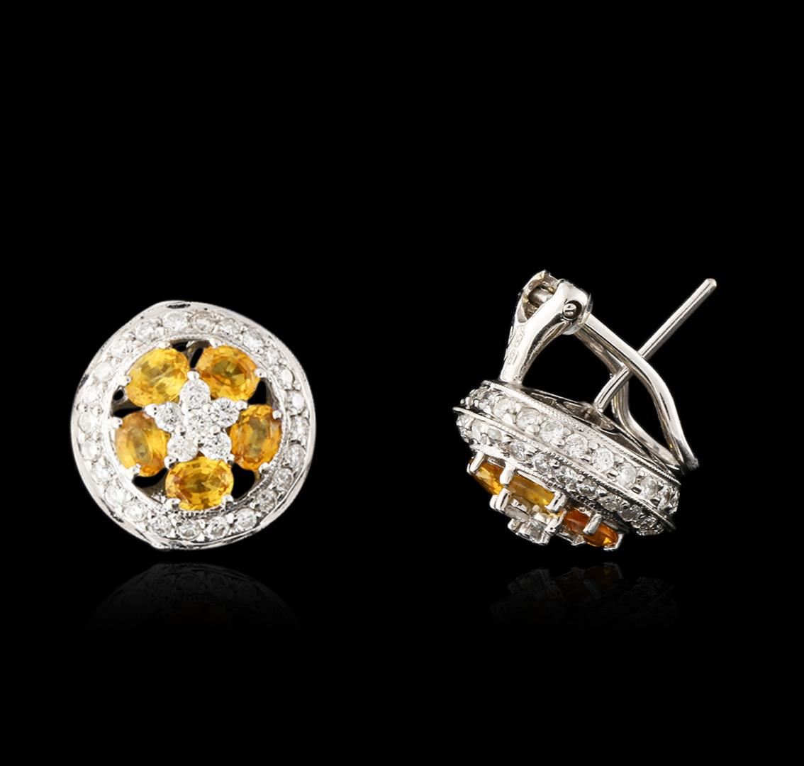 One pair electronically tested 18KT white gold ladies cast & assembled yellow sapphire and diamond earrings with omega backs. Bright polish finish with milgrain detailing. Identified with markings of "18K". Condition is good. Containing: Ten prong set oval mixed cut natural yellow sapphires, measuring 4.00 x 3.00 x 1.95mm, approximate total weight of 1.90ct., clarity is eye clean, type II, medium dark, brownish, orangy yellow color, (GIA oY 6/3), cut is good. Transmitting light with no distortion, transparent. Measurements & the color grade are an average for the group. Graded in the setting. One Hundred Twenty prong set round brilliant cut diamonds, measuring 1.60 - 1.50 x 0.93mm (depth est.) approximate total weight of 120 Stones = 1.73ct. Graded in the setting. Clarity: SI-1 to I-1. Color: G - I. Total Weight of Colored Stones 1.90ct. Total Weight of Diamonds 1.73ct. Total Weight of Earrings 7.60 grams. AIG Appraised at $7,255.00.