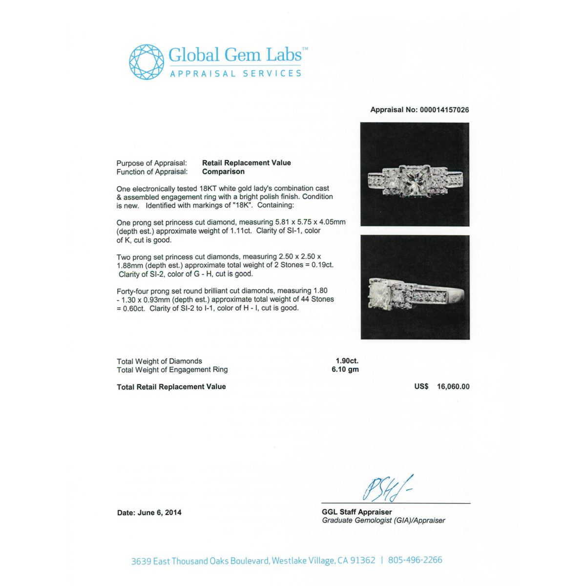 One electronically tested 18KT white gold Ladies combination cast & assembled engagement ring with a bright polish finish. Condition is new. Identified with markings of "18K". Containing: One prong set princess cut diamond, measuring 5.81 x 5.75 x 4.05mm (depth est.) approximate weight of 1.11ct. Clarity: SI-1. Color: K, Cut is Good. Two prong set princess cut diamonds, measuring 2.50 x 2.50 x 1.88mm (depth est.) approximate. Total Weight of 2 Stones = 0.19ct. Clarity: SI-2. Color: G - H, Cut is Good. Forty-Four prong set round brilliant cut diamonds, measuring 1.80 - 1.30 x 0.93mm (depth est.) approximate. Total Weight of 44 Stones = 0.60ct. Clarity: SI-2 to I-1. Color: H - I, Cut is Good. Total Weight of Diamonds 1.90ct. Total Weight of Engagement Ring 6.10 grams. GGL Appraised at $16,060.00.