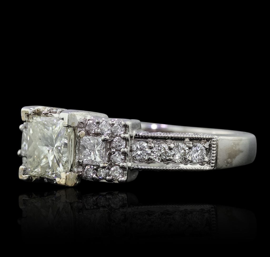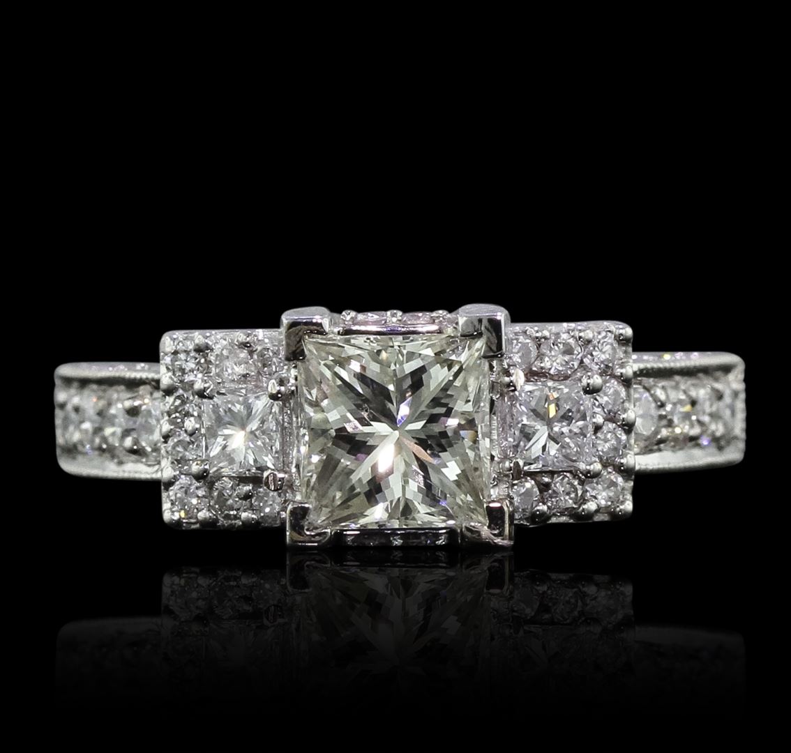 One electronically tested 18KT white gold Ladies combination cast & assembled engagement ring with a bright polish finish. Condition is new. Identified with markings of "18K". Containing: One prong set princess cut diamond, measuring 5.81 x 5.75 x 4.05mm (depth est.) approximate weight of 1.11ct. Clarity: SI-1. Color: K, Cut is Good. Two prong set princess cut diamonds, measuring 2.50 x 2.50 x 1.88mm (depth est.) approximate. Total Weight of 2 Stones = 0.19ct. Clarity: SI-2. Color: G - H, Cut is Good. Forty-Four prong set round brilliant cut diamonds, measuring 1.80 - 1.30 x 0.93mm (depth est.) approximate. Total Weight of 44 Stones = 0.60ct. Clarity: SI-2 to I-1. Color: H - I, Cut is Good. Total Weight of Diamonds 1.90ct. Total Weight of Engagement Ring 6.10 grams. GGL Appraised at $16,060.00.