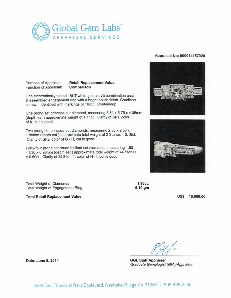 One electronically tested 18KT white gold Ladies combination cast & assembled engagement ring with a bright polish finish. Condition is new. Identified with markings of "18K". Containing: One prong set princess cut diamond, measuring 5.81 x 5.75 x 4.05mm (depth est.) approximate weight of 1.11ct. Clarity: SI-1. Color: K, Cut is Good. Two prong set princess cut diamonds, measuring 2.50 x 2.50 x 1.88mm (depth est.) approximate. Total Weight of 2 Stones = 0.19ct. Clarity: SI-2. Color: G - H, Cut is Good. Forty-Four prong set round brilliant cut diamonds, measuring 1.80 - 1.30 x 0.93mm (depth est.) approximate. Total Weight of 44 Stones = 0.60ct. Clarity: SI-2 to I-1. Color: H - I, Cut is Good. Total Weight of Diamonds 1.90ct. Total Weight of Engagement Ring 6.10 grams. GGL Appraised at $16,060.00.