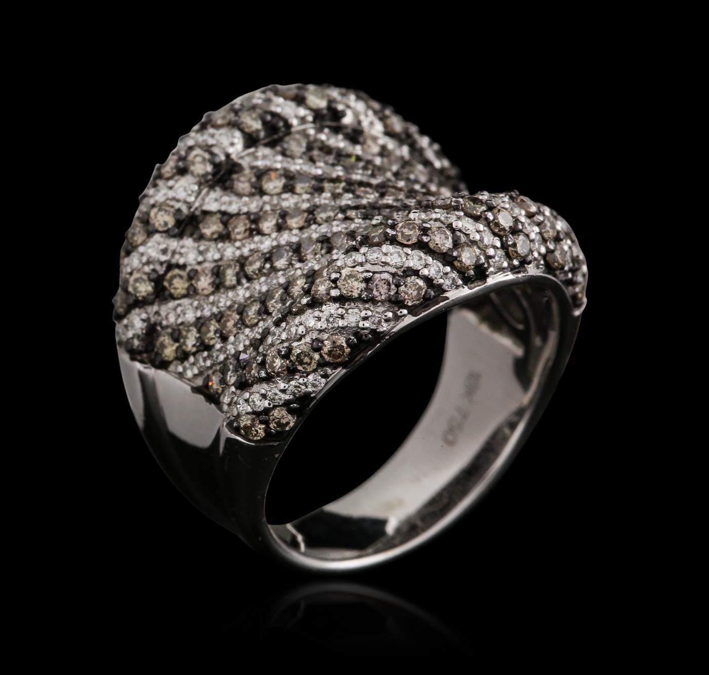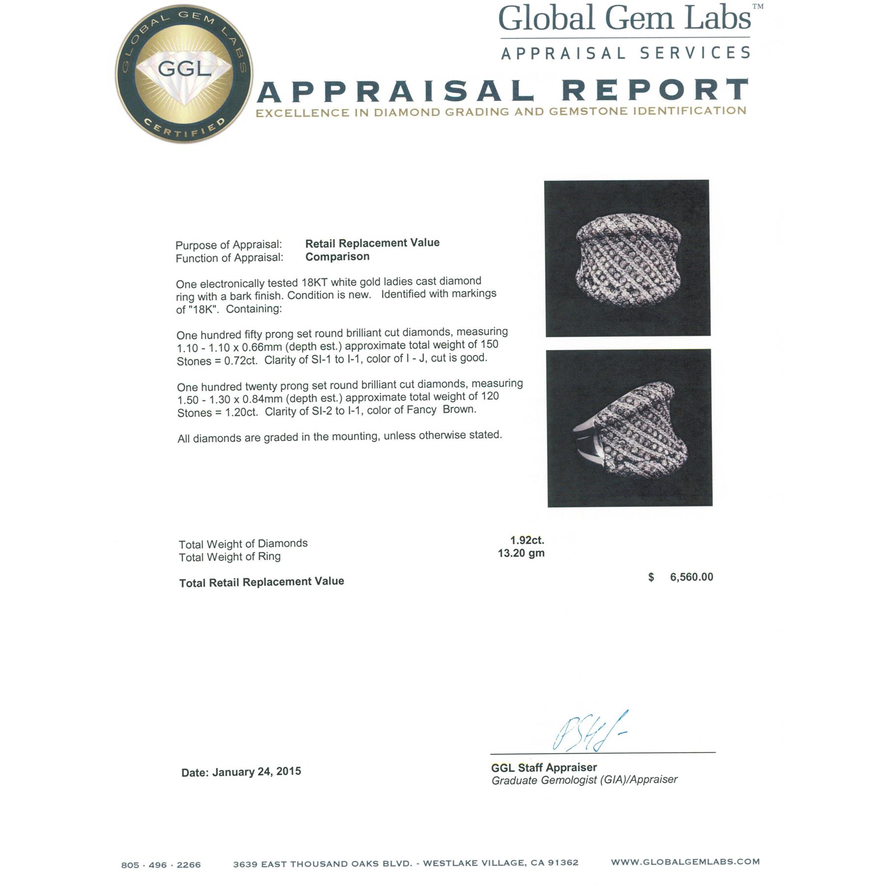 One electronically tested 18KT white gold ladies cast diamond ring with a bark finish. Identified with markings of "18K". Condition is new. Containing: One Hundred Fifty prong set round brilliant cut diamonds, measuring 1.10 - 1.10 x 0.66mm (depth est.) approximate total weight of 150 Stones = 0.72ct. Clarity: SI-1 to I-1. Color: I - J, Cut is Good. One Hundred Twenty prong set round brilliant cut diamonds, measuring 1.50 - 1.30 x 0.84mm (depth est.) approximate total weight of 120 Stones = 1.20ct. Clarity: SI-2 to I-1. All diamonds are graded in the mounting, unless otherwise stated. Total Weight of Diamonds 1.92ct. Total Weight of Ring 13.20 grams. GGL Appraised at $6,560.00.