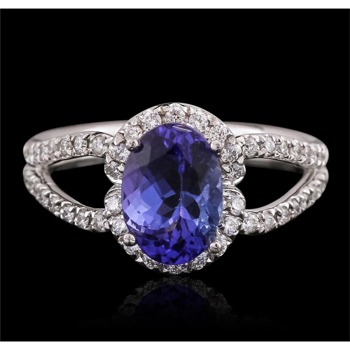 One electronically tested 18KT white gold ladies combination cast & assembled prong set ring with a split shoulder shank with a bright polish finish. Identified with markings of "750". Condition is new. Containing: One prong set oval modified brilliant cut natural tanzanite, measuring 9.06 x 6.48 x 4.76mm, approximate weight of 1.93ct., clarity is eye clean, type I, medium, moderately strong, bluish violet color, (GIA bV 5/4), cut is good. Seventy prong set round brilliant cut diamonds, measuring 1.10 - 1.10 x 0.66mm (depth est.) approximate total weight of 70 Stones = 0.49ct. Clarity: SI-2 to I-1. Color: H - I, Cut is Good. All diamonds and colored gemstones are graded in the mounting, unless otherwise stated, Colored gemstones are presumed to have been subjected to commonly used enhancement processes. Total Weight of Colored Stones 1.93ct. Total Weight of Diamonds 0.49ct. Total Weight of Ring 4.80 grams. GGL Appraised at $6,450.00.