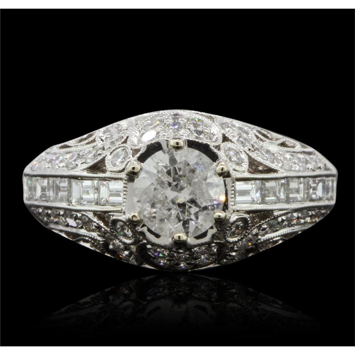 One electronically tested 18KT white gold ladies cast diamond unity ring. Condition is new, good workmanship. The featured diamond is set within a diamond set curvature, completed by a grooved three and one-half millimeter wide band. Bright polish finish with milgrain detailing. Identified with markings of "18K 750". Containing: One prong set round brilliant cut diamond, measuring 5.80 - 5.70 x 3.35mm (depth est.) approximate weight of 0.77ct with a medium strong blue fluorescence. Graded in the setting. Clarity: I-2. Color: I Depth 58.3%. Table 62.6%. Forty-Four bead & bezel set round brilliant cut diamonds, measuring 1.60 - 1.50 x 0.93mm (depth est.) approximate. Total Weight of 44 Stones = 0.69ct. Graded in the setting. Clarity: VS-1 to SI-1. Color: G - I Ten channel set baguette cut diamonds, measuring from 2.50 x 1.70 x 1.19mm (depth est.) to 2.60 x 1.80 x 1.26mm (depth est.) approximate. Total Weight of 10 Stones = 0.50ct. Graded in the setting. Clarity: VVS-1 to VVS-2 Color G - I. Total Weight of Diamonds 1.96ct. Total Weight of Ring 7.06 grams. AIG Appraised at $10,475.00.