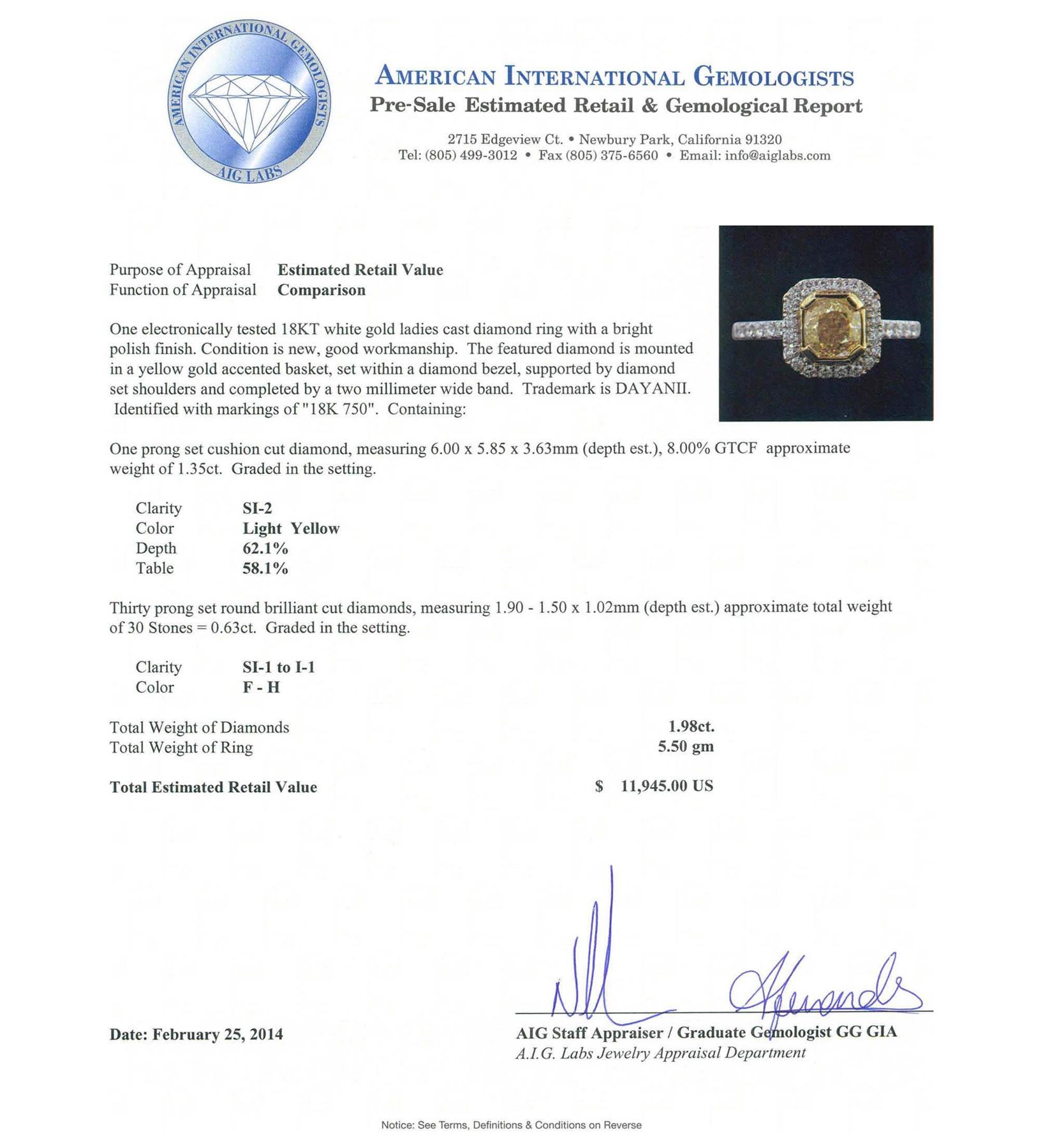 One electronically tested 18KT white gold ladies cast diamond ring with a bright polish finish. Condition is new, good workmanship. The featured diamond is mounted in a yellow gold accented basket, set within a diamond bezel, supported by diamond set shoulders and completed by a two millimeter wide band. Trademark is DAYANII. Identified with markings of "18K 750". Containing: One prong set cushion cut diamond, measuring 6.00 x 5.85 x 3.63mm (depth est.), 8.00% GTCF approximate weight of 1.35ct. Graded in the setting. Clarity SI-2 Depth 62.1%Table 58.1% Thirty prong set round brilliant cut diamonds, measuring 1.90 - 1.50 x 1.02mm (depth est.) approximate total weight of 30 Stones = 0.63ct. Graded in the setting. Clarity SI-1 to I-1 Color F - H Total Weight of Diamonds 1.98ct. Total Weight of Ring 5.50 grams. AIG Appraised at $11,945.00.