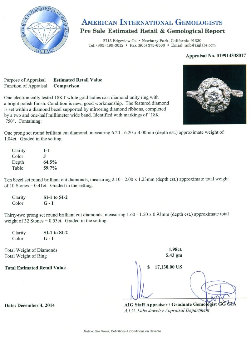 One electronically tested 18KT white gold ladies cast diamond unity ring with a bright polish finish. The featured diamond is set within a diamond bezel supported by mirroring diamond ribbons, completed by a two and one-half millimeter wide band. Identified with markings of "18K 750". Condition is new, good workmanship. Containing: One prong set round brilliant cut diamond, measuring 6.20 - 6.20 x 4.00mm (depth est.) approximate weight of 1.04ct. Graded in the setting. Clarity: I-1. Color: J. Depth 64.5%. Table 59.7%. Ten bezel set round brilliant cut diamonds, measuring 2.10 - 2.00 x 1.23mm (depth est.) approximate total weight of 10 Stones = 0.41ct. Graded in the setting. Clarity: SI-1 to SI-2. Color: G - I Thirty-Two prong set round brilliant cut diamonds, measuring 1.60 - 1.50 x 0.93mm (depth est.) approximate total weight of 32 Stones = 0.53ct. Graded in the setting. Clarity: SI-1 to SI-2. Color: G - I. Total Weight of Diamonds 1.98ct. Total Weight of Ring 5.43 grams. AIG Appraised at $17,130.00.