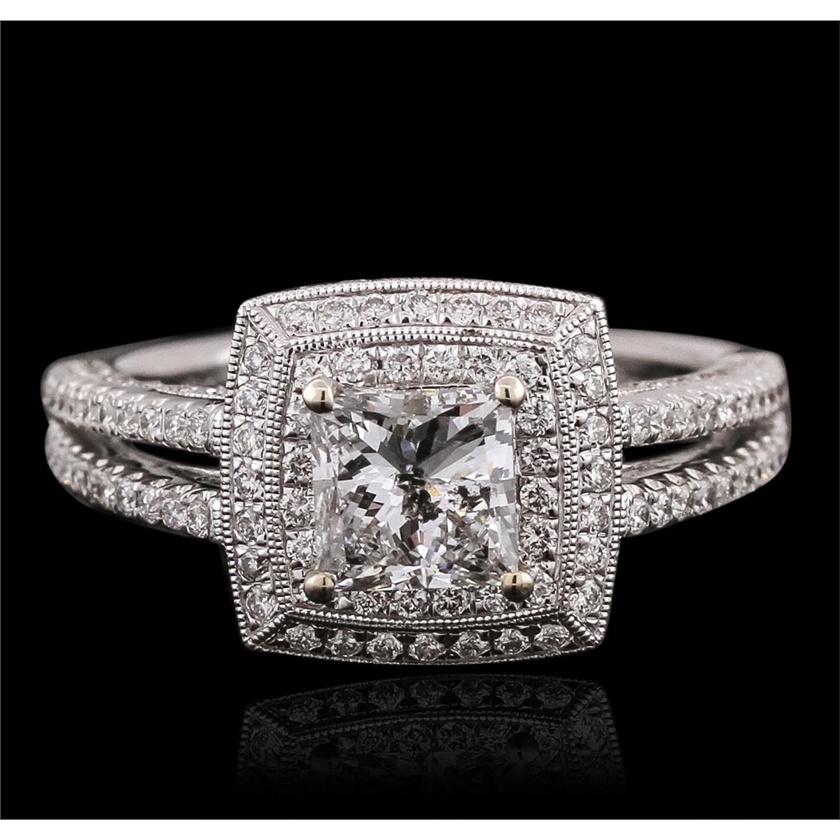One electronically tested 18KT white gold ladies combination cast & assembled engagement ring with a bright polish finish. Identified with markings of "18K". Condition is new. Containing: One prong set princess cut diamond, measuring 5.62 x 5.54 x 4.16mm (depth est.) approximate weight of 1.06ct. Clarity: I-1. Color: J, Cut is Good. One Hundred Forty-Seven prong set round brilliant cut diamonds, measuring 1.20 - 1.20 x 0.72mm (depth est.) approximate total weight of 147 Stones = 0.93ct. Clarity: SI-2 to I-1. Color: I - J, Cut is Good. All diamonds are graded in the mounting, unless otherwise stated. Total Weight of Diamonds 1.99ct. Total Weight of Ring 6.30 grams. GGL Appraised at $15,575.00.