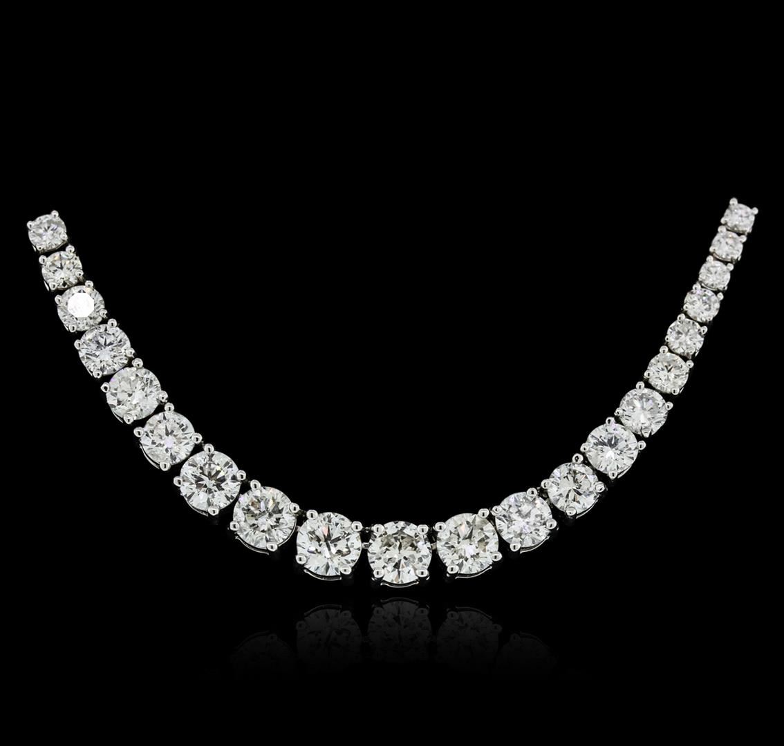 One electronically tested 18KT white gold ladies cast diamond necklace with a hidden box clasp with safety closer with a bright polish finish. Measurements: 16.25" in length Identified with markings of "750". Condition is new. Containing: Fifteen prong set round brilliant cut diamonds, measuring 4.50 - 3.80 x 2.49mm (depth est.) approximate total weight of 15 Stones = 3.92ct. Clarity: SI-1 to SI-2. Color: I - J, Cut is Good. One Hundred Forty prong set round brilliant cut diamonds, measuring 2.50 - 2.20 x 1.41mm (depth est.) approximate total weight of 140 Stones = 6.65ct. Clarity: SI-1 to I-1. Color: I - J, Cut is Good. All diamonds are graded in the mounting, unless otherwise stated. Total Weight of Diamonds 10.57ct. Total Weight of Necklace 19.00 grams. GGL Appraised at $23,525.00.
