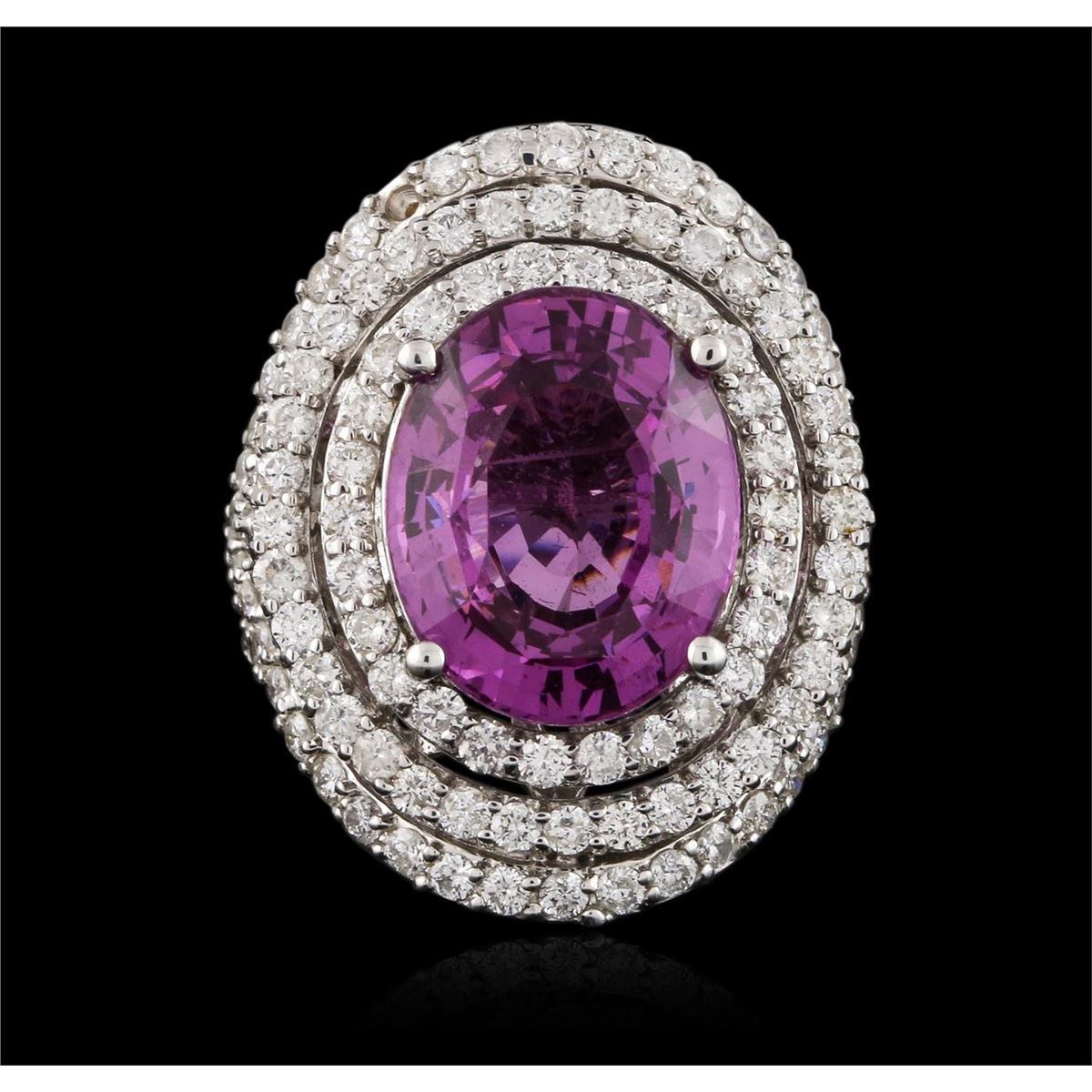 One electronically tested 18KT white gold ladies cast spinel and diamond ring with a bright polish finish. Identified with markings of "18K". Condition is new. Containing: One prong set oval modified brilliant cut natural pink spinel, measuring 15.00. x 12.10 x 7.87mm, approximate weight of 10.80ct., clarity is eye clean, type II, medium light, very slightly brownish, purple color, (GIA slpR 4/3), cut is good. One Hundred Twenty-Eight prong set round brilliant cut diamonds, measuring 1.70 - 1.70 x 1.02mm (depth est.) approximate total weight of 128 Stones = 2.29ct. Clarity: I-1 to I-2. Color: I - J, Cut is Good. Colored gemstones are presumed to have been subjected to commonly used enhancement processes. All diamonds and colored gemstones are graded in the mounting, unless otherwise stated. Total Weight of Colored Stones 10.80ct. Total Weight of Diamonds 2.29ct. Total Weight of Ring 18.70 grams. GGL Appraised at $23,885.00.
