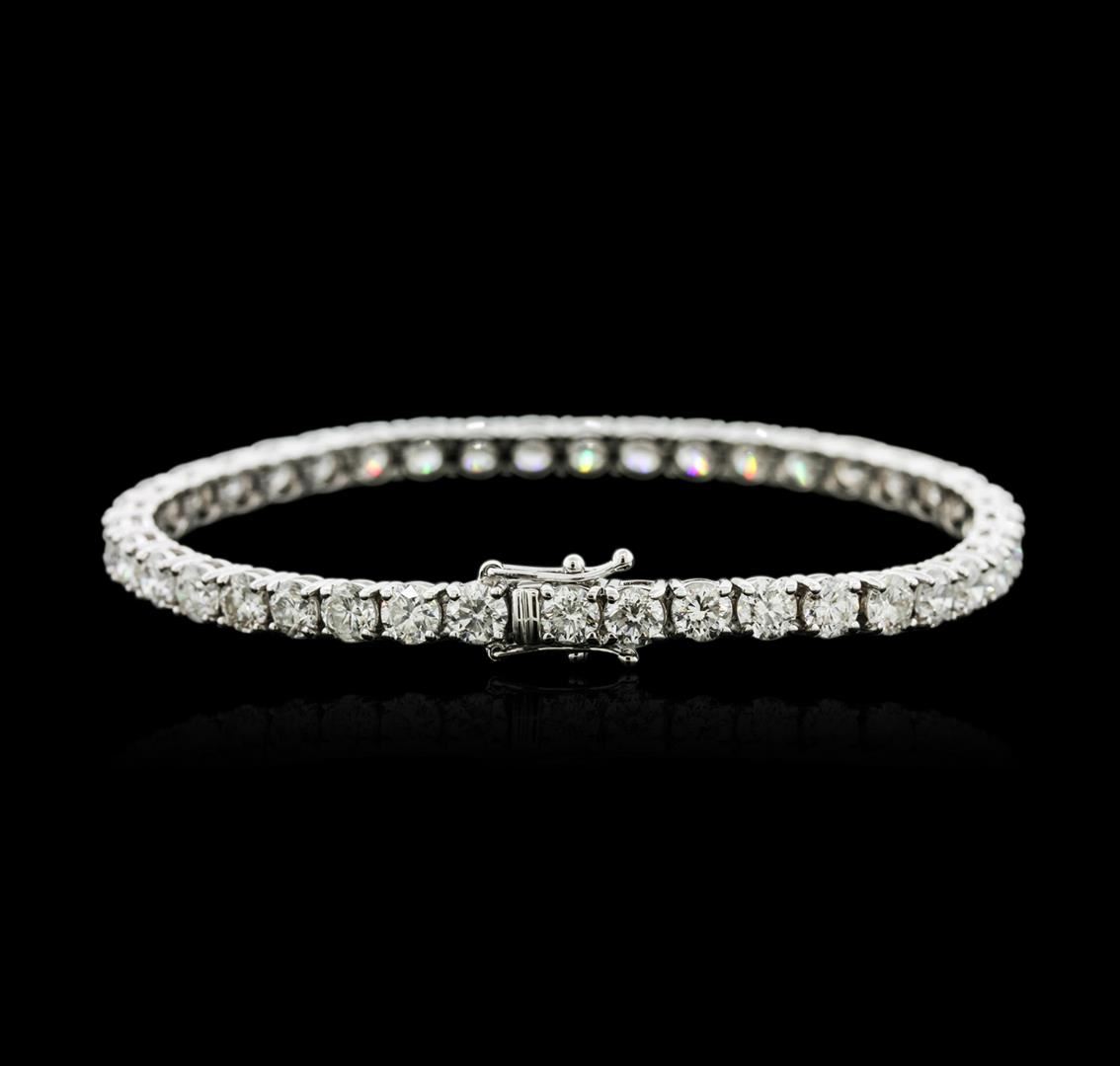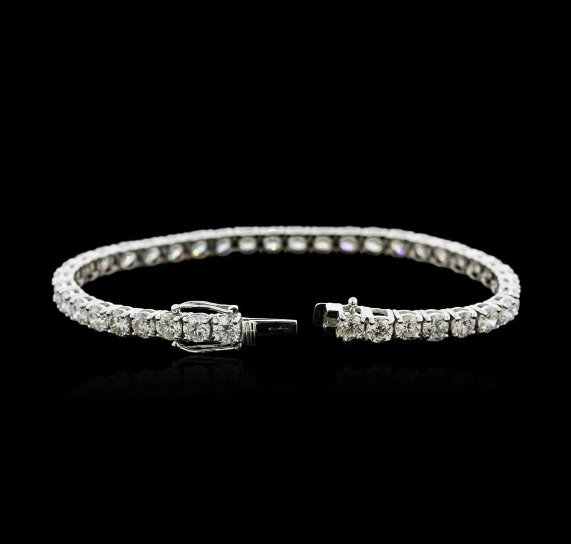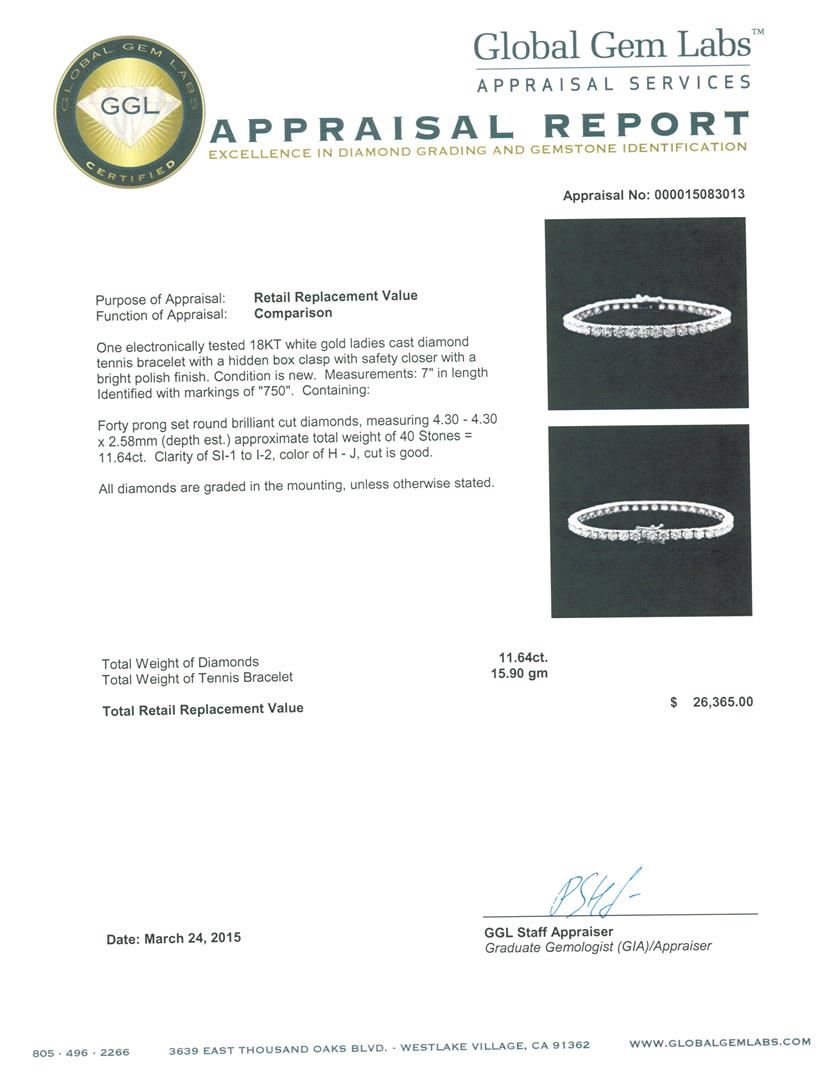 One electronically tested 18KT white gold ladies cast diamond tennis bracelet with a hidden box clasp with safety closer with a bright polish finish. Measurements: 7" in length Identified with markings of "750". Condition is new. Containing: Forty prong set round brilliant cut diamonds, measuring 4.30 - 4.30 x 2.58mm (depth est.) approximate total weight of 40 Stones = 11.64ct. Clarity: SI-1 to I-2. Color: H - J, Cut is Good. All diamonds are graded in the mounting, unless otherwise stated. Total Weight of Diamonds 11.64ct. Total Weight of Tennis Bracelet 15.90 grams. GGL Appraised at $26,365.00.