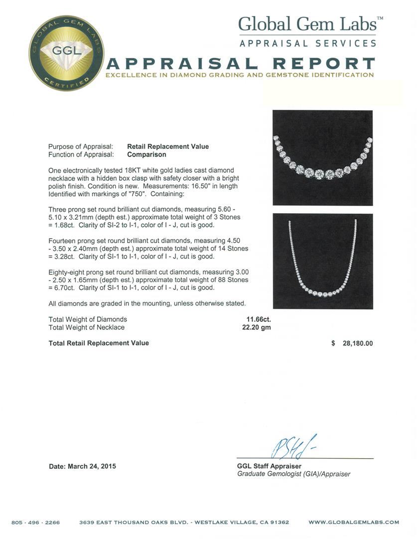 One electronically tested 18KT white gold ladies cast diamond necklace with a hidden box clasp with safety closer with a bright polish finish. Measurements: 16.50" in length Identified with markings of "750". Condition is new. Containing: Three prong set round brilliant cut diamonds, measuring 5.60 - 5.10 x 3.21mm (depth est.) approximate total weight of 3 Stones = 1.68ct. Clarity: SI-2 to I-1. Color: I - J, Cut is Good. Fourteen prong set round brilliant cut diamonds, measuring 4.50 - 3.50 x 2.40mm (depth est.) approximate total weight of 14 Stones = 3.28ct. Clarity: SI-1 to I-1. Color: I - J, Cut is Good. Eighty-Eight prong set round brilliant cut diamonds, measuring 3.00 - 2.50 x 1.65mm (depth est.) approximate total weight of 88 Stones = 6.70ct. Clarity: SI-1 to I-1. Color: I - J, Cut is Good. All diamonds are graded in the mounting, unless otherwise stated. Total Weight of Diamonds 11.66ct. Total Weight of Necklace 22.20 grams. GGL Appraised at $28,180.00.