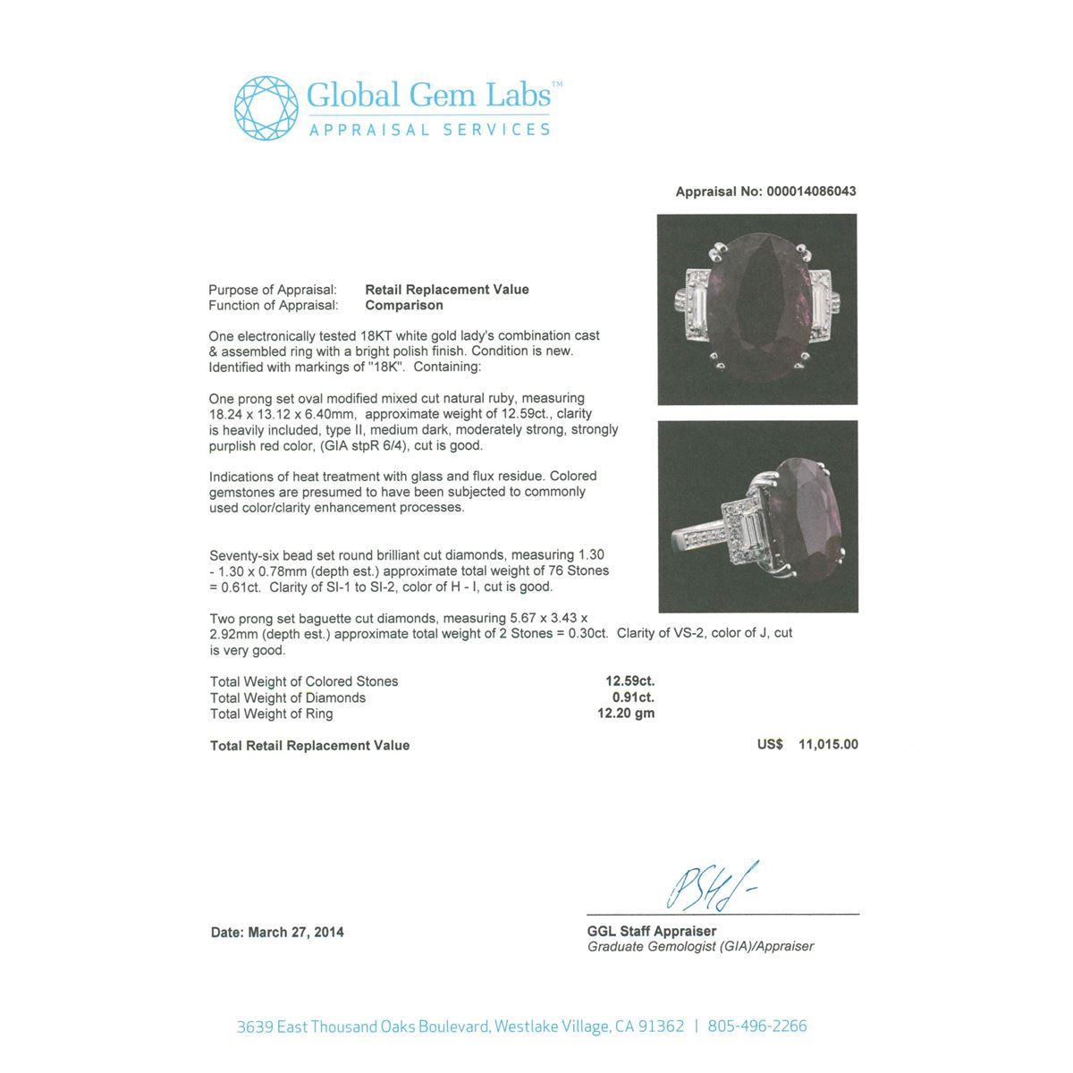 One electronically tested 18KT white gold Ladies combination cast & assembled ring with a bright polish finish. Condition is new. Identified with markings of "18K". Containing: One prong set oval modified mixed cut natural ruby, measuring 18.24 x 13.12 x 6.40mm, approximate weight of 12.59ct., clarity is heavily included, type II, medium dark, moderately strong, strongly purplish red color, (GIA stpR 6/4), cut is good. Indications of heat treatment with glass and flux residue. Colored gemstones are presumed to have been subjected to commonly used color/clarity enhancement processes. Seventy-Six bead set round brilliant cut diamonds, measuring 1.30 - 1.30 x 0.78mm (depth est.) approximate. Total Weight of 76 Stones = 0.61ct. Clarity: SI-1 to SI-2. Color: H - I, Cut is Good. Two prong set baguette cut diamonds, measuring 5.67 x 3.43 x 2.92mm (depth est.) approximate. Total Weight of 2 Stones = 0.30ct. Clarity: VS-2. Color: J, Cut is Very Good. Total Weight of Colored Stones 12.59ct. Total Weight of Diamonds 0.91ct. Total Weight of Ring 12.20 grams. GGL Appraised at $11,015.00.