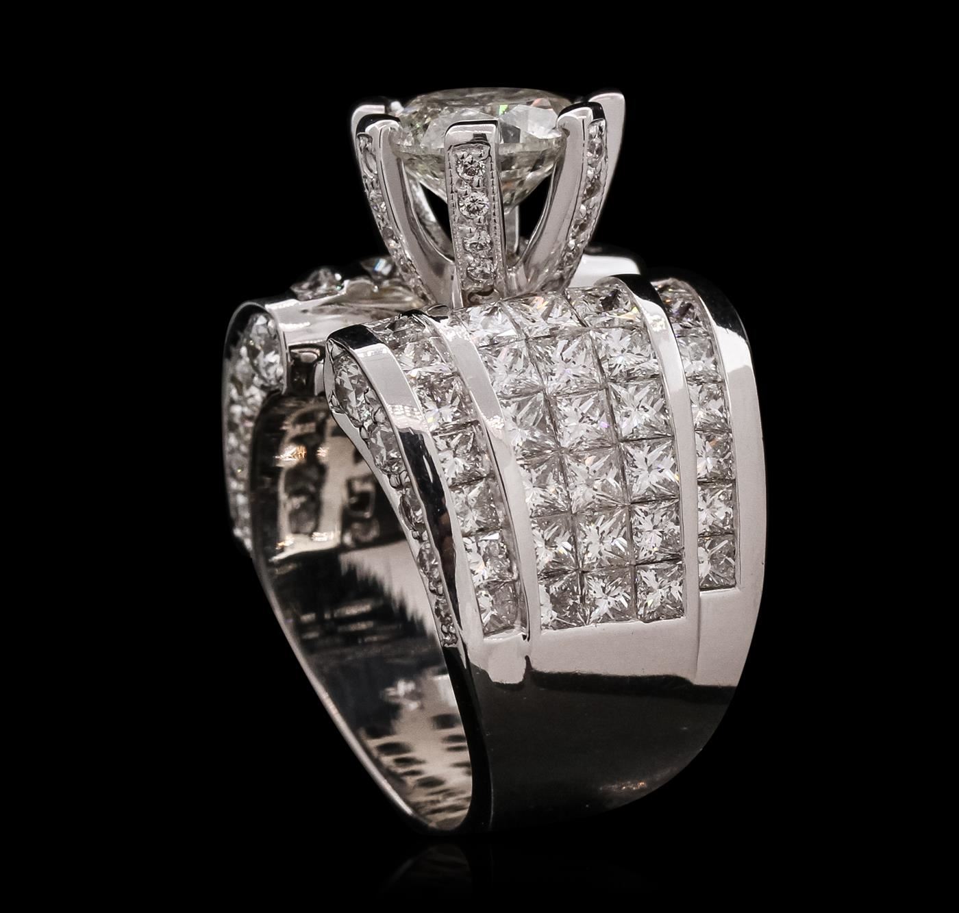 One electronically tested 18KT white gold ladies cast diamond unity ring. The featured diamond is set within diamond accented prongs supported by elaborate diamond set shoulders, completed by a seven and one-half millimeter wide band. Bright polish finish with milgrain detailing. Identified with markings of "18K". Condition is new, good workmanship. Containing: One prong set round brilliant cut diamond, measuring 9.30 - 9.25 x 5.80mm (depth est.), 4.00% GTCF approximate weight of 3.26ct. Diamond Grading Report attached. Graded in the setting. Clarity: I-1. Color: 62.5%. Table 63.6%. Forty-Two channel set princess cut diamonds, measuring 2.80 x 2.70 x 2.03mm (depth est.) approximate total weight of 42 Stones = 5.38ct. Graded in the setting. Clarity: VS-2 to SI-2. Color: G - I Twenty-Eight channel set princess cut diamonds, measuring 2.40 x 2.30 x 1.73mm (depth est.) approximate total weight of 28 Stones = 2.29ct. Graded in the setting. Clarity: VS-2 to SI-1. Color: G - I Twenty-Two bead set round brilliant cut diamonds, measuring 3.20 - 2.00 x 1.56mm (depth est.) approximate total weight of 22 Stones = 1.40ct. Graded in the setting. Clarity: VS-1 to SI-1. Color: G - I Twenty-Eight bead set round brilliant cut diamonds, measuring 1.50 - 1.40 x 0.87mm (depth est.) approximate total weight of 28 Stones = 0.41ct. Graded in the setting. Clarity: VS-1 to VS-2. Color: G - I. Total Weight of Diamonds 12.74ct. Total Weight of Unity Ring 30.29 grams. AIG Appraised at $79,830.00.