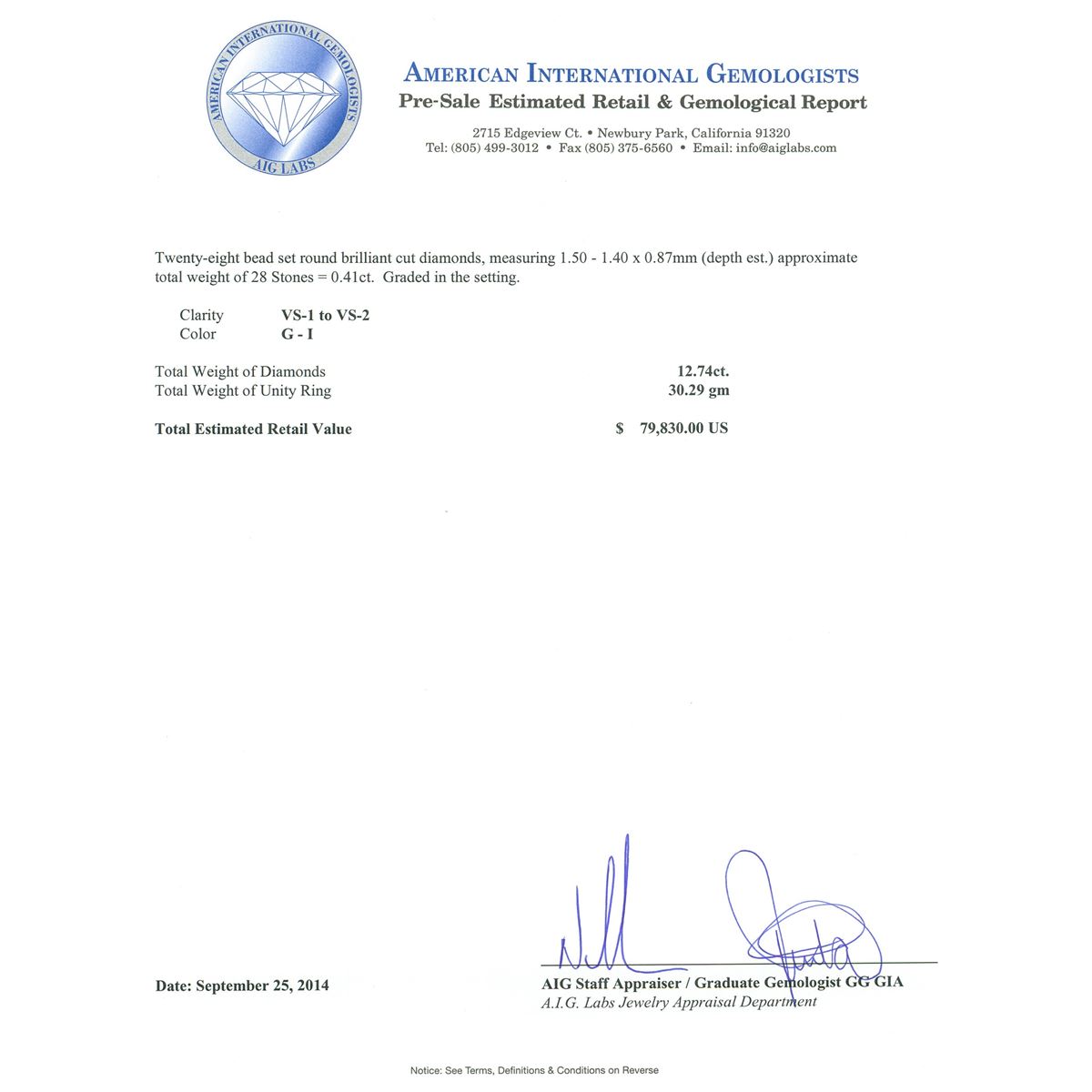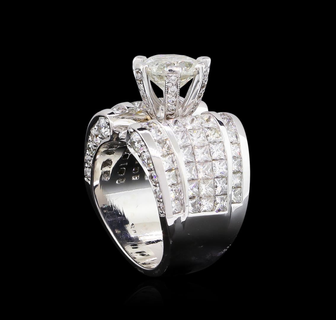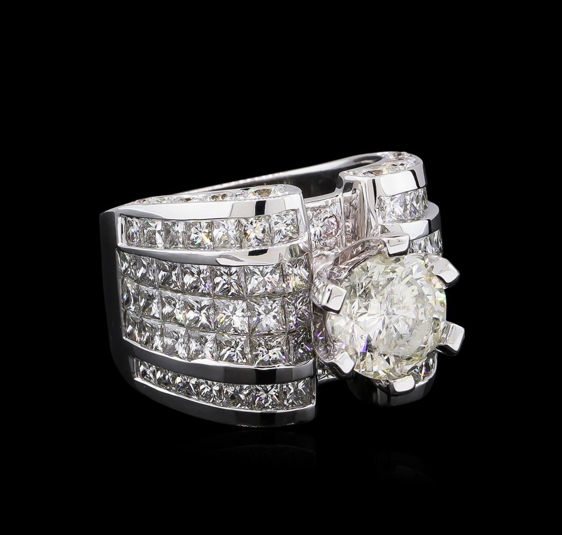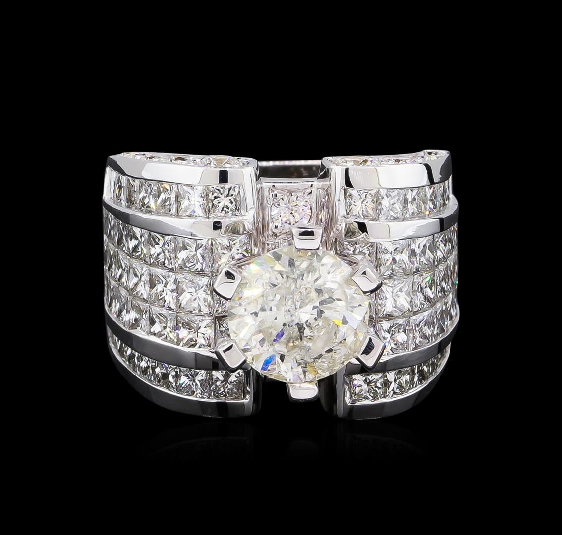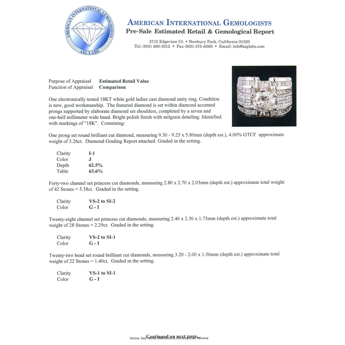 One electronically tested 18KT white gold ladies cast diamond unity ring. The featured diamond is set within diamond accented prongs supported by elaborate diamond set shoulders, completed by a seven and one-half millimeter wide band. Bright polish finish with milgrain detailing. Identified with markings of "18K". Condition is new, good workmanship. Containing: One prong set round brilliant cut diamond, measuring 9.30 - 9.25 x 5.80mm (depth est.), 4.00% GTCF approximate weight of 3.26ct. Diamond Grading Report attached. Graded in the setting. Clarity: I-1. Color: 62.5%. Table 63.6%. Forty-Two channel set princess cut diamonds, measuring 2.80 x 2.70 x 2.03mm (depth est.) approximate total weight of 42 Stones = 5.38ct. Graded in the setting. Clarity: VS-2 to SI-2. Color: G - I Twenty-Eight channel set princess cut diamonds, measuring 2.40 x 2.30 x 1.73mm (depth est.) approximate total weight of 28 Stones = 2.29ct. Graded in the setting. Clarity: VS-2 to SI-1. Color: G - I Twenty-Two bead set round brilliant cut diamonds, measuring 3.20 - 2.00 x 1.56mm (depth est.) approximate total weight of 22 Stones = 1.40ct. Graded in the setting. Clarity: VS-1 to SI-1. Color: G - I Twenty-Eight bead set round brilliant cut diamonds, measuring 1.50 - 1.40 x 0.87mm (depth est.) approximate total weight of 28 Stones = 0.41ct. Graded in the setting. Clarity: VS-1 to VS-2. Color: G - I. Total Weight of Diamonds 12.74ct. Total Weight of Unity Ring 30.29 grams. AIG Appraised at $79,830.00.