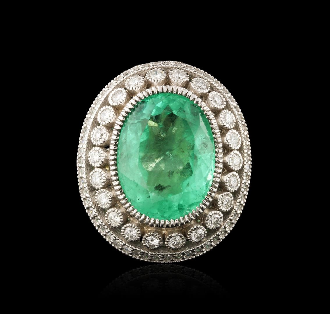 One electronically tested 18KT white gold ladies cast emerald and diamond ring with a bright polish finish. Identified with markings of "18K". Condition is new. Containing: One bezel set oval modified brilliant cut natural emerald, measuring 17.76 x 14.00 x 9.40mm, approximate weight of 13.35ct., clarity is heavily included, type III, medium light, very slightly grayish, very slightly bluish green color, (GIA vslbG 4/3), cut is good. Twenty-Eight gypsy set round brilliant cut diamonds, measuring 1.90 - 1.90 x 1.14mm (depth est.) approximate total weight of 28 Stones = 0.70ct. Clarity: SI-2 to I-1. Color: H - I. Sixty-Four prong set round brilliant cut diamonds, measuring 1.30 - 1.30 x 0.78mm (depth est.) approximate total weight of 64 Stones = 0.51ct. Clarity: I-1 to I-2. Color: H - I. Colored gemstones are presumed to have been subjected to commonly used enhancement processes. All diamonds and colored gemstones are graded in the mounting, unless otherwise stated. Total Weight of Colored Stones 13.35ct. Total Weight of Diamonds 1.22ct. Total Weight of Ring 20.10 grams. GGL Appraised at $31,330.00.