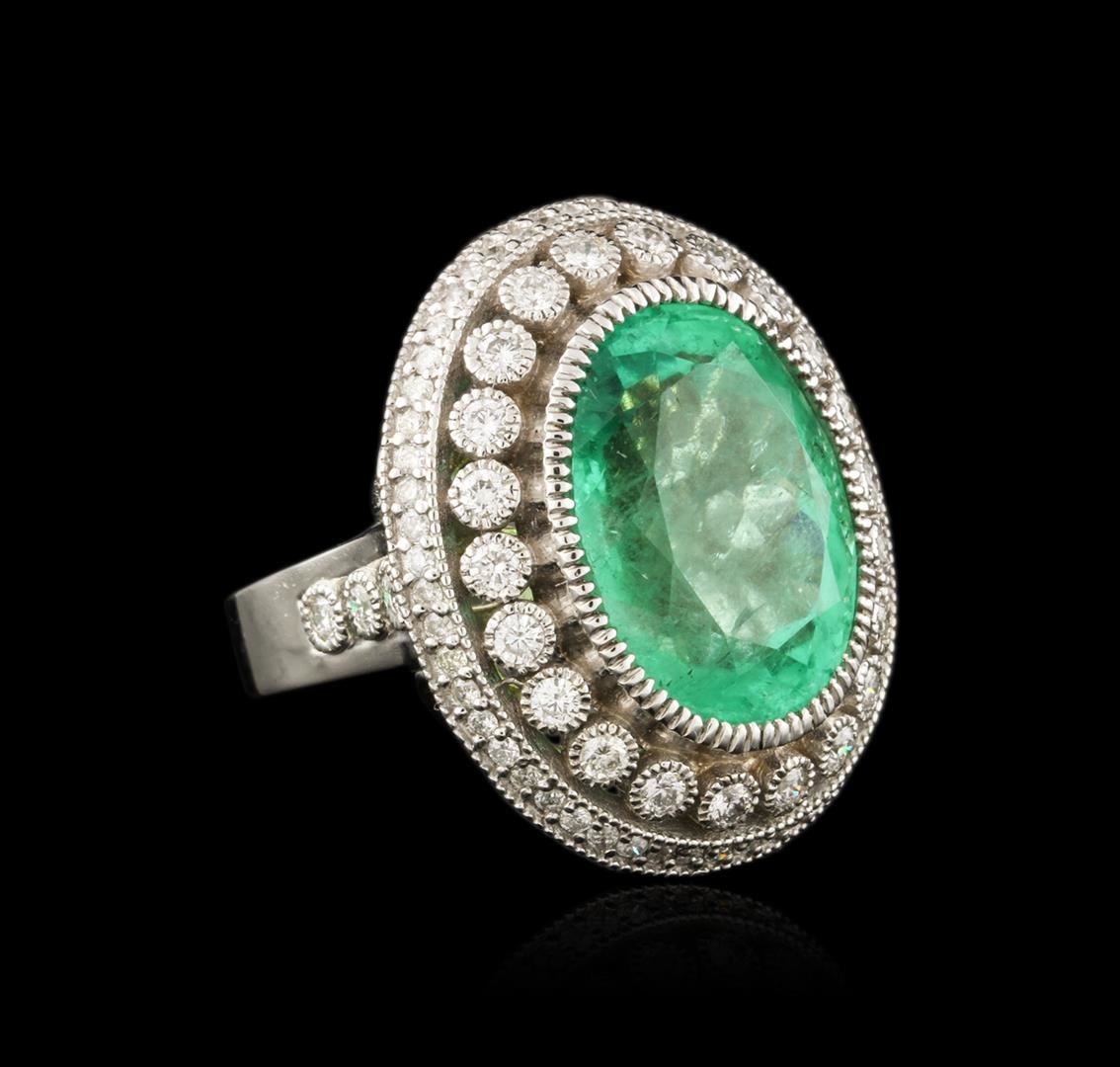 One electronically tested 18KT white gold ladies cast emerald and diamond ring with a bright polish finish. Identified with markings of "18K". Condition is new. Containing: One bezel set oval modified brilliant cut natural emerald, measuring 17.76 x 14.00 x 9.40mm, approximate weight of 13.35ct., clarity is heavily included, type III, medium light, very slightly grayish, very slightly bluish green color, (GIA vslbG 4/3), cut is good. Twenty-Eight gypsy set round brilliant cut diamonds, measuring 1.90 - 1.90 x 1.14mm (depth est.) approximate total weight of 28 Stones = 0.70ct. Clarity: SI-2 to I-1. Color: H - I. Sixty-Four prong set round brilliant cut diamonds, measuring 1.30 - 1.30 x 0.78mm (depth est.) approximate total weight of 64 Stones = 0.51ct. Clarity: I-1 to I-2. Color: H - I. Colored gemstones are presumed to have been subjected to commonly used enhancement processes. All diamonds and colored gemstones are graded in the mounting, unless otherwise stated. Total Weight of Colored Stones 13.35ct. Total Weight of Diamonds 1.22ct. Total Weight of Ring 20.10 grams. GGL Appraised at $31,330.00.