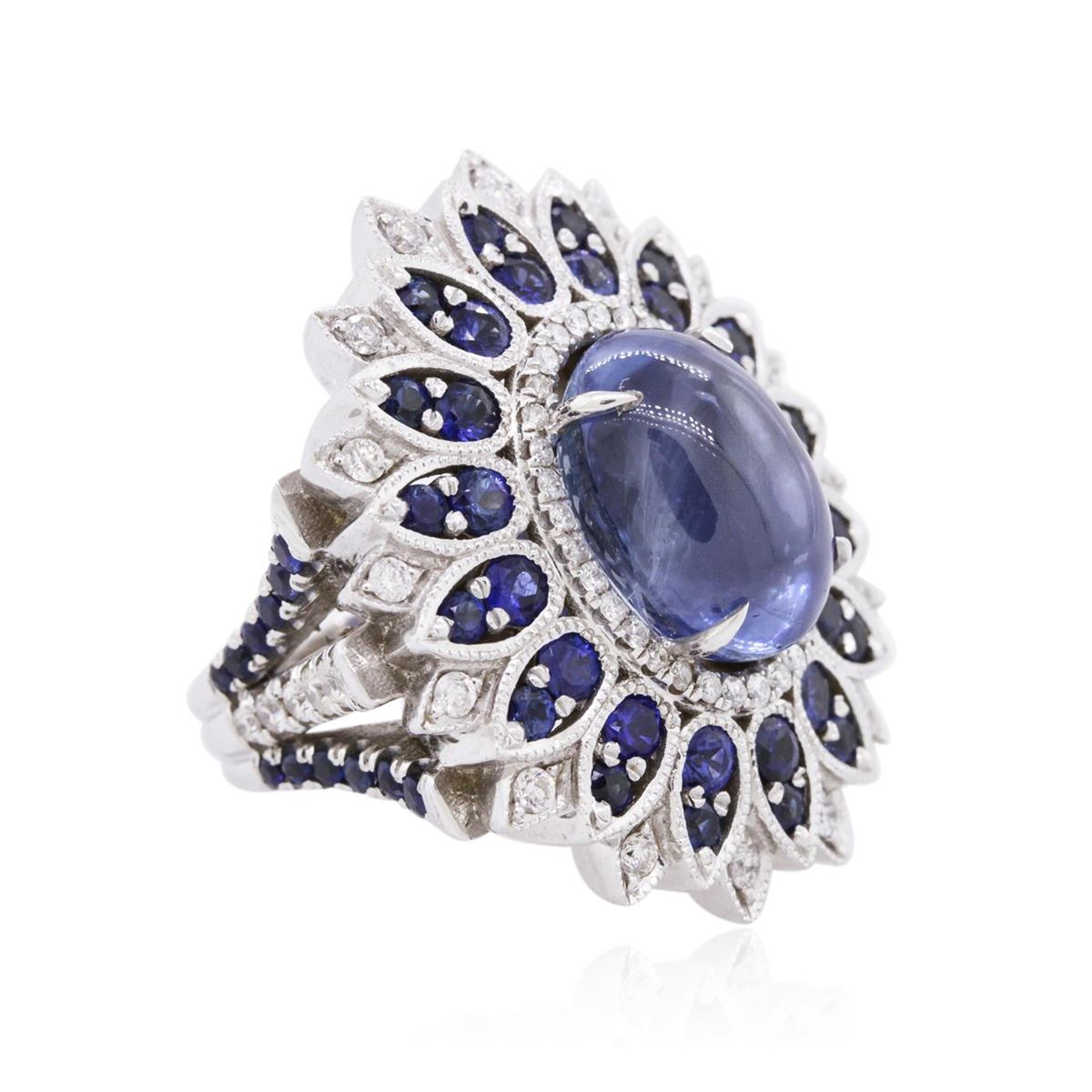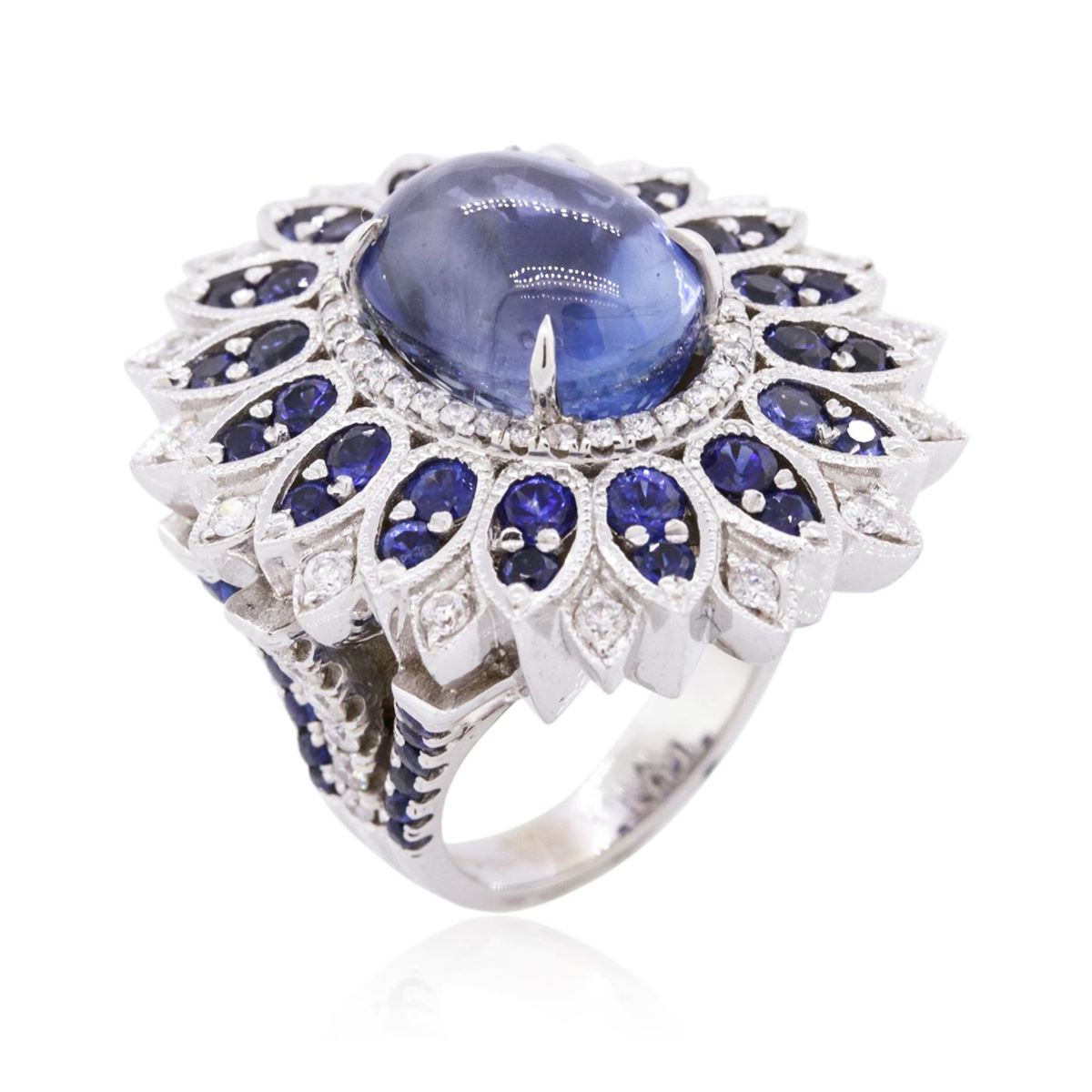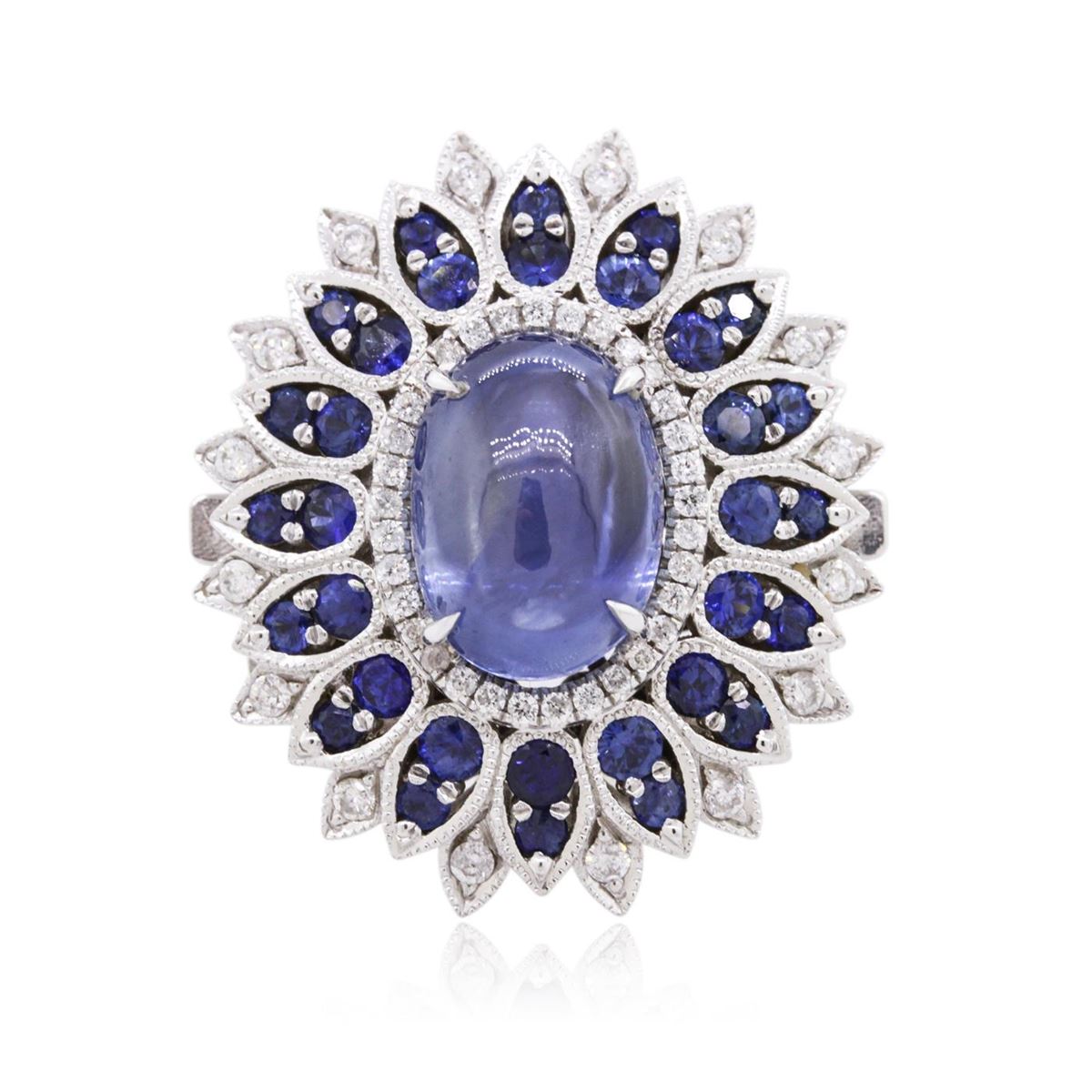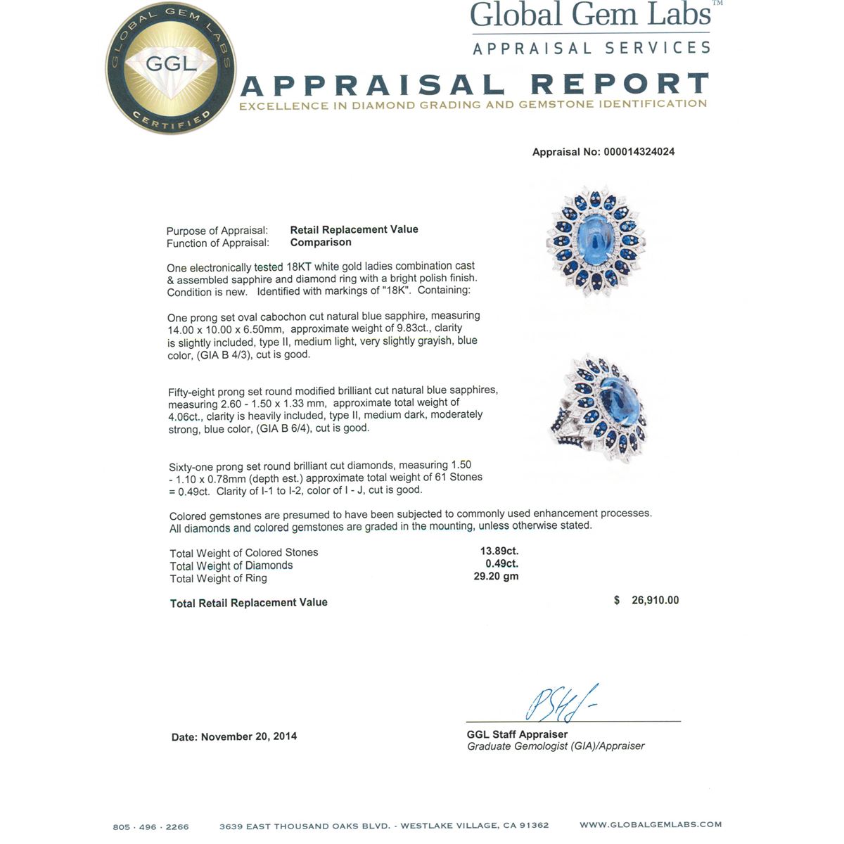 One electronically tested 18KT white gold ladies combination cast & assembled sapphire and diamond ring with a bright polish finish. Identified with markings of "18K". Condition is new. Containing: One prong set oval cabochon cut natural blue sapphire, measuring 14.00 x 10.00 x 6.50mm, approximate weight of 9.83ct., clarity is slightly included, type II, medium light, very slightly grayish, blue color, (GIA B 4/3), cut is good. Fifty-eight prong set round modified brilliant cut natural blue sapphires, measuring 2.60 - 1.50 x 1.33 mm, approximate total weight of 4.06ct., clarity is heavily included, type II, medium dark, moderately strong, blue color, (GIA B 6/4), cut is good. Sixty-One prong set round brilliant cut diamonds, measuring 1.50 - 1.10 x 0.78mm (depth est.) approximate total weight of 61 Stones = 0.49ct. Clarity: I-1 to I-2. Color: I - J, Cut is Good. Colored gemstones are presumed to have been subjected to commonly used enhancement processes. All diamonds and colored gemstones are graded in the mounting, unless otherwise stated. Total Weight of Colored Stones 13.89ct. Total Weight of Diamonds 0.49ct. Total Weight of Ring 29.20 grams. GGL Appraised at $26,910.00.