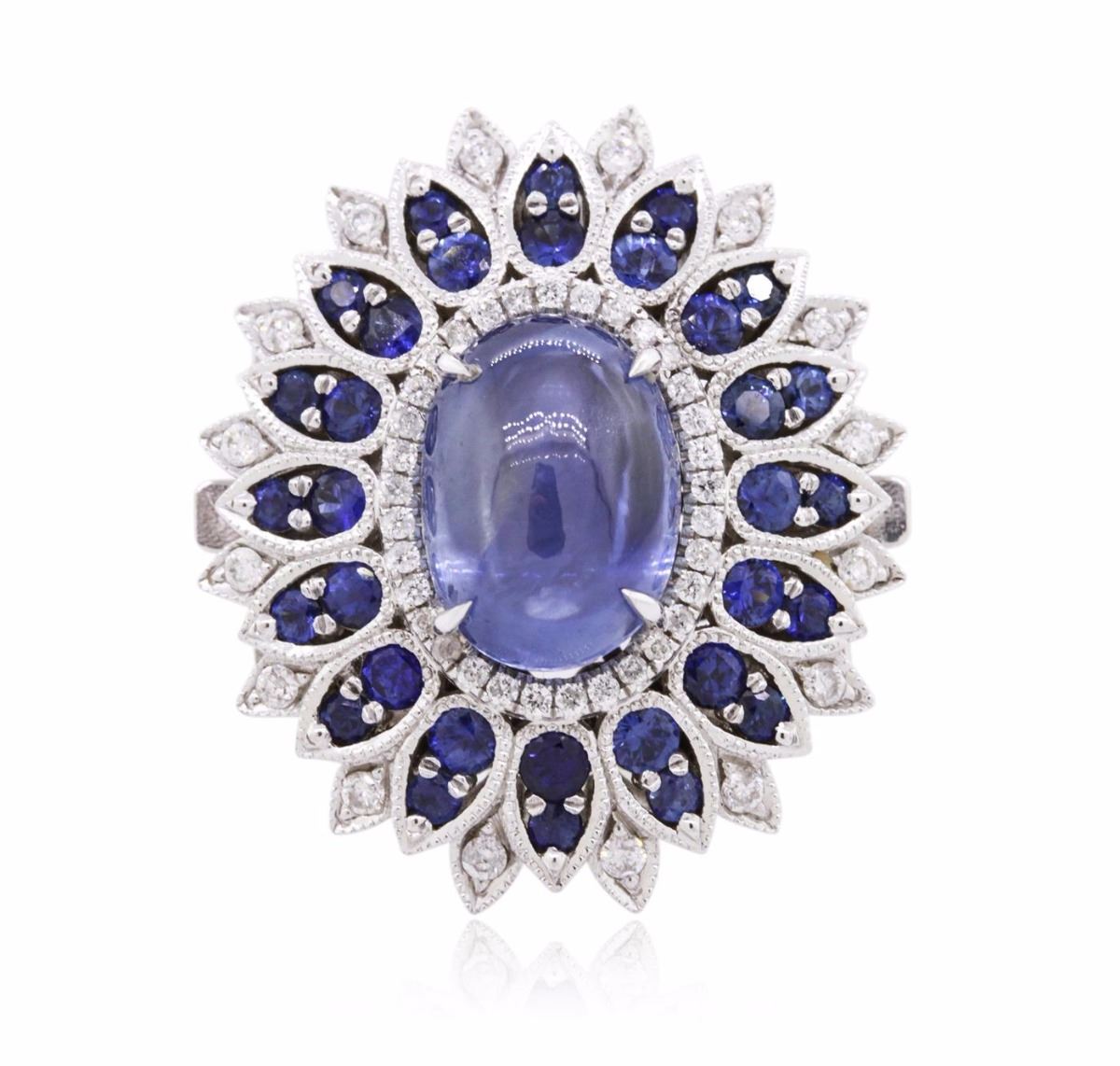 One electronically tested 18KT white gold ladies combination cast & assembled sapphire and diamond ring with a bright polish finish. Identified with markings of "18K". Condition is new. Containing: One prong set oval cabochon cut natural blue sapphire, measuring 14.00 x 10.00 x 6.50mm, approximate weight of 9.83ct., clarity is slightly included, type II, medium light, very slightly grayish, blue color, (GIA B 4/3), cut is good. Fifty-eight prong set round modified brilliant cut natural blue sapphires, measuring 2.60 - 1.50 x 1.33 mm, approximate total weight of 4.06ct., clarity is heavily included, type II, medium dark, moderately strong, blue color, (GIA B 6/4), cut is good. Sixty-One prong set round brilliant cut diamonds, measuring 1.50 - 1.10 x 0.78mm (depth est.) approximate total weight of 61 Stones = 0.49ct. Clarity: I-1 to I-2. Color: I - J, Cut is Good. Colored gemstones are presumed to have been subjected to commonly used enhancement processes. All diamonds and colored gemstones are graded in the mounting, unless otherwise stated. Total Weight of Colored Stones 13.89ct. Total Weight of Diamonds 0.49ct. Total Weight of Ring 29.20 grams. GGL Appraised at $26,910.00.