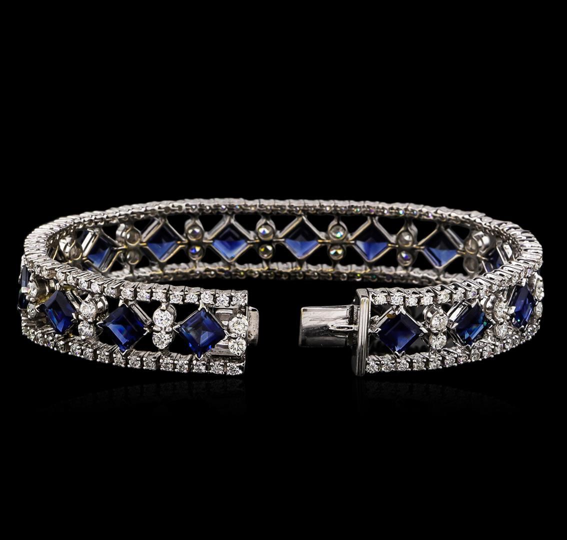 One electronically tested 18KT white gold ladies cast & assembled sapphire and diamond bracelet with a bright polish finish. Condition is good. Seven inch length, one-half inch wide bracelet features a sapphire and diamond ribbon supported by mirroring diamond ribbons, terminating in a concealed clasp with safety bar. Identified with markings of "18K". Containing: Sixteen prong set square step cut natural blue sapphires, measuring 5.40 x 5.40 x 3.50mm, approximate total weight of 16.40ct., clarity is slightly included, type II, medium dark, very slightly grayish, violetish blue color, (GIA vB 6/3), cut is good. Transmitting light somewhat diffusely, transparent to translucent. Naturally occurring internal & external characteristics are present, including partial color zoning. Measurements & the color grade are an average for the group. Graded in the setting. Thirty-two prong set round brilliant cut diamonds, measuring 2.60 - 2.50 x 1.53mm (depth est.) approximate total weight of 32 Stones = 2.00ct. Graded in the setting. Clarity VS-2 to SI-2. Color G -- I. One hundred fifty-two prong set round brilliant cut diamonds, measuring 1.70 - 1.60 x 0.99mm (depth est.) approximate total weight of 152 Stones = 2.60ct. Graded in the setting. Clarity VS-1 to SI-1. Color G -- I. Total Weight of Colored Stones 16.40ct. Total Weight of Diamonds 4.60ct. Total Weight of Bracelet 37.71gm. AIG Appraised at $36,800.00.