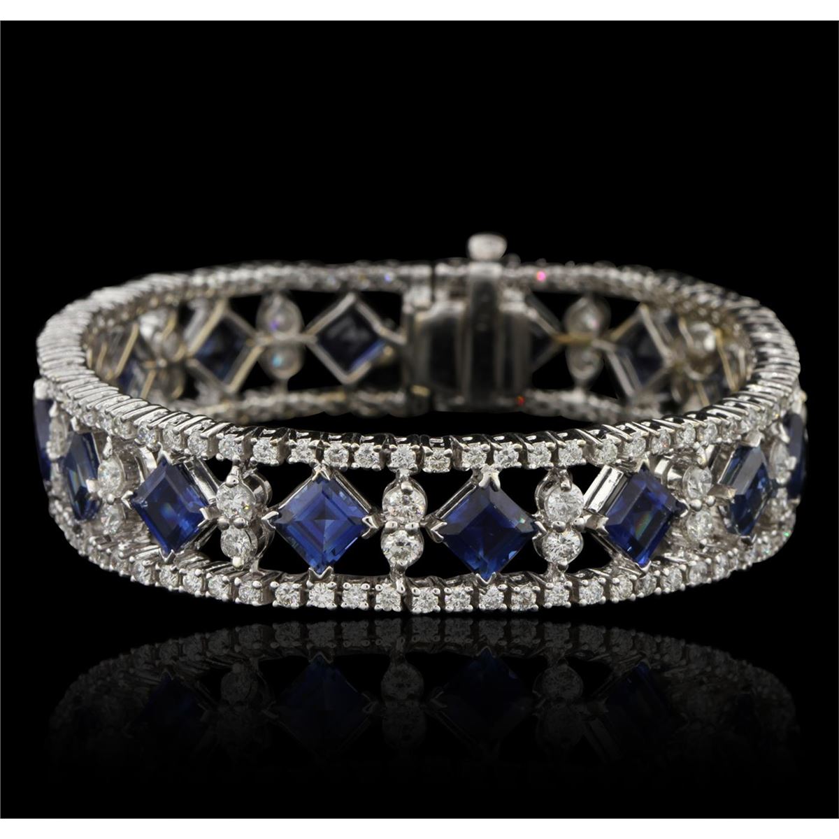 One electronically tested 18KT white gold ladies cast & assembled sapphire and diamond bracelet with a bright polish finish. Condition is good. Seven inch length, one-half inch wide bracelet features a sapphire and diamond ribbon supported by mirroring diamond ribbons, terminating in a concealed clasp with safety bar. Identified with markings of "18K". Containing: Sixteen prong set square step cut natural blue sapphires, measuring 5.40 x 5.40 x 3.50mm, approximate total weight of 16.40ct., clarity is slightly included, type II, medium dark, very slightly grayish, violetish blue color, (GIA vB 6/3), cut is good. Transmitting light somewhat diffusely, transparent to translucent. Naturally occurring internal & external characteristics are present, including partial color zoning. Measurements & the color grade are an average for the group. Graded in the setting. Thirty-two prong set round brilliant cut diamonds, measuring 2.60 - 2.50 x 1.53mm (depth est.) approximate total weight of 32 Stones = 2.00ct. Graded in the setting. Clarity VS-2 to SI-2. Color G -- I. One hundred fifty-two prong set round brilliant cut diamonds, measuring 1.70 - 1.60 x 0.99mm (depth est.) approximate total weight of 152 Stones = 2.60ct. Graded in the setting. Clarity VS-1 to SI-1. Color G -- I. Total Weight of Colored Stones 16.40ct. Total Weight of Diamonds 4.60ct. Total Weight of Bracelet 37.71gm. AIG Appraised at $36,800.00.