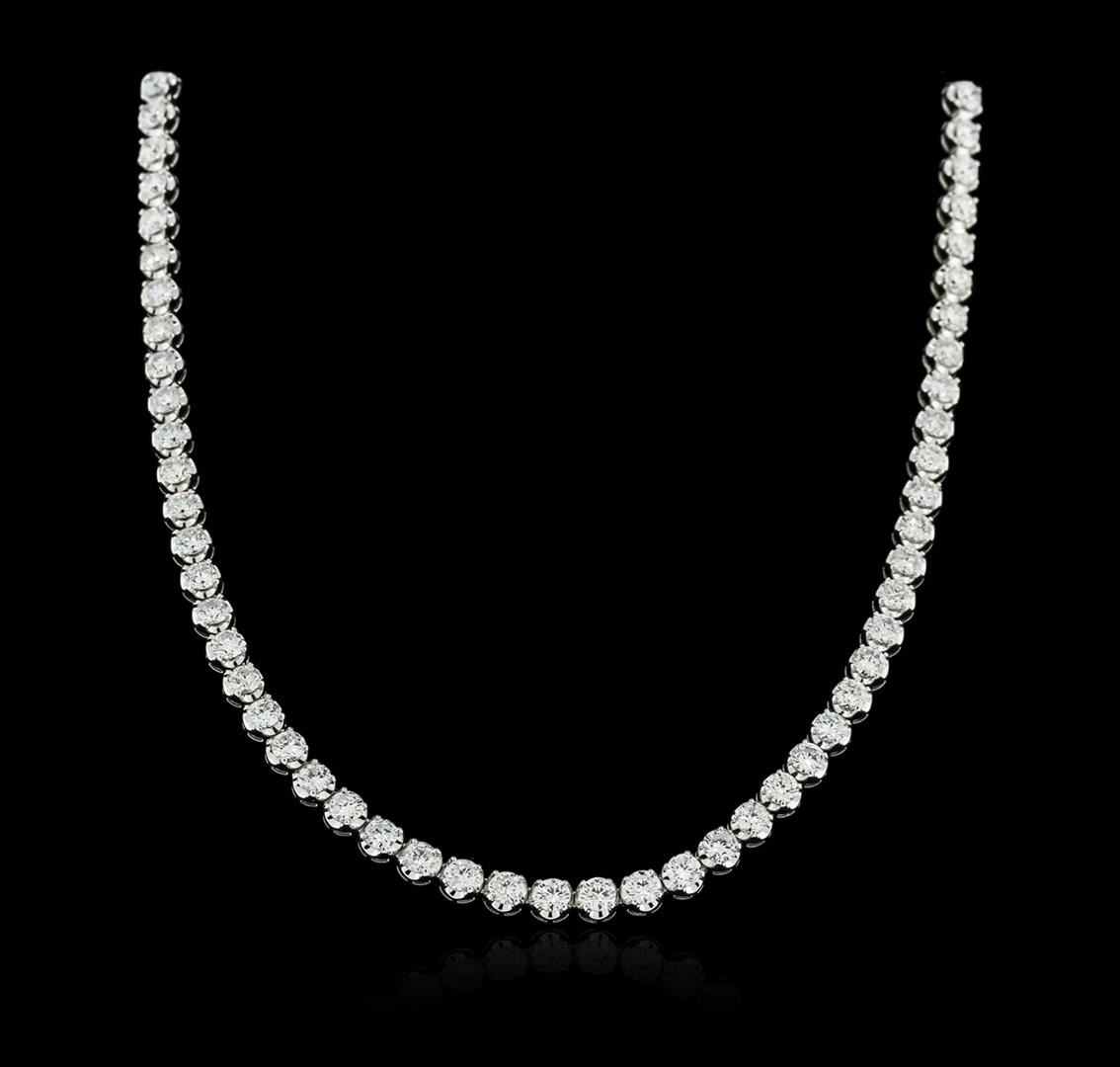 One electronically tested 18KT white gold ladies cast diamond necklace with a hidden box clasp with safety closer with a bright polish finish. Measurements: 16.25" in length Identified with markings of "750". Condition is new. Containing: Seventy-Six prong set round brilliant cut diamonds, measuring 4.00 - 3.80 x 2.34mm (depth est.) approximate total weight of 76 Stones = 16.50ct. Clarity: SI-1 to SI-2. Color: I - J, Cut is Good. All diamonds are graded in the mounting, unless otherwise stated. Total Weight of Diamonds 16.50ct. Total Weight of Necklace 28.80 grams. GGL Appraised at $46,415.00.