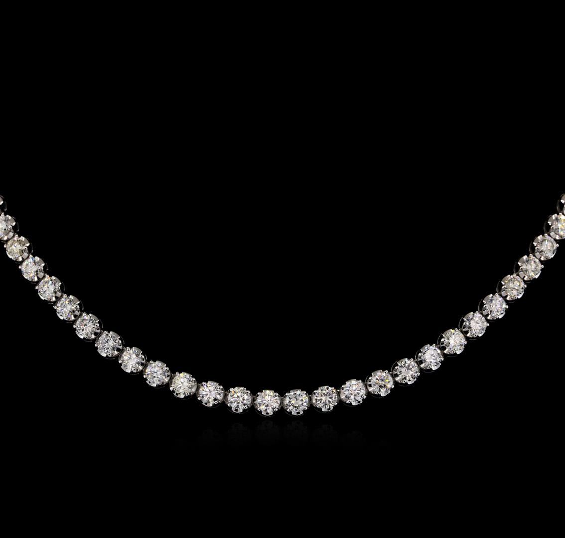 One electronically tested 18KT white gold ladies cast diamond necklace with a hidden box clasp with safety closer with a bright polish finish. Measurements: 16.25" in length Identified with markings of "750". Condition is new. Containing: Seventy-Six prong set round brilliant cut diamonds, measuring 4.00 - 3.80 x 2.34mm (depth est.) approximate total weight of 76 Stones = 16.50ct. Clarity: SI-1 to SI-2. Color: I - J, Cut is Good. All diamonds are graded in the mounting, unless otherwise stated. Total Weight of Diamonds 16.50ct. Total Weight of Necklace 28.80 grams. GGL Appraised at $46,415.00.