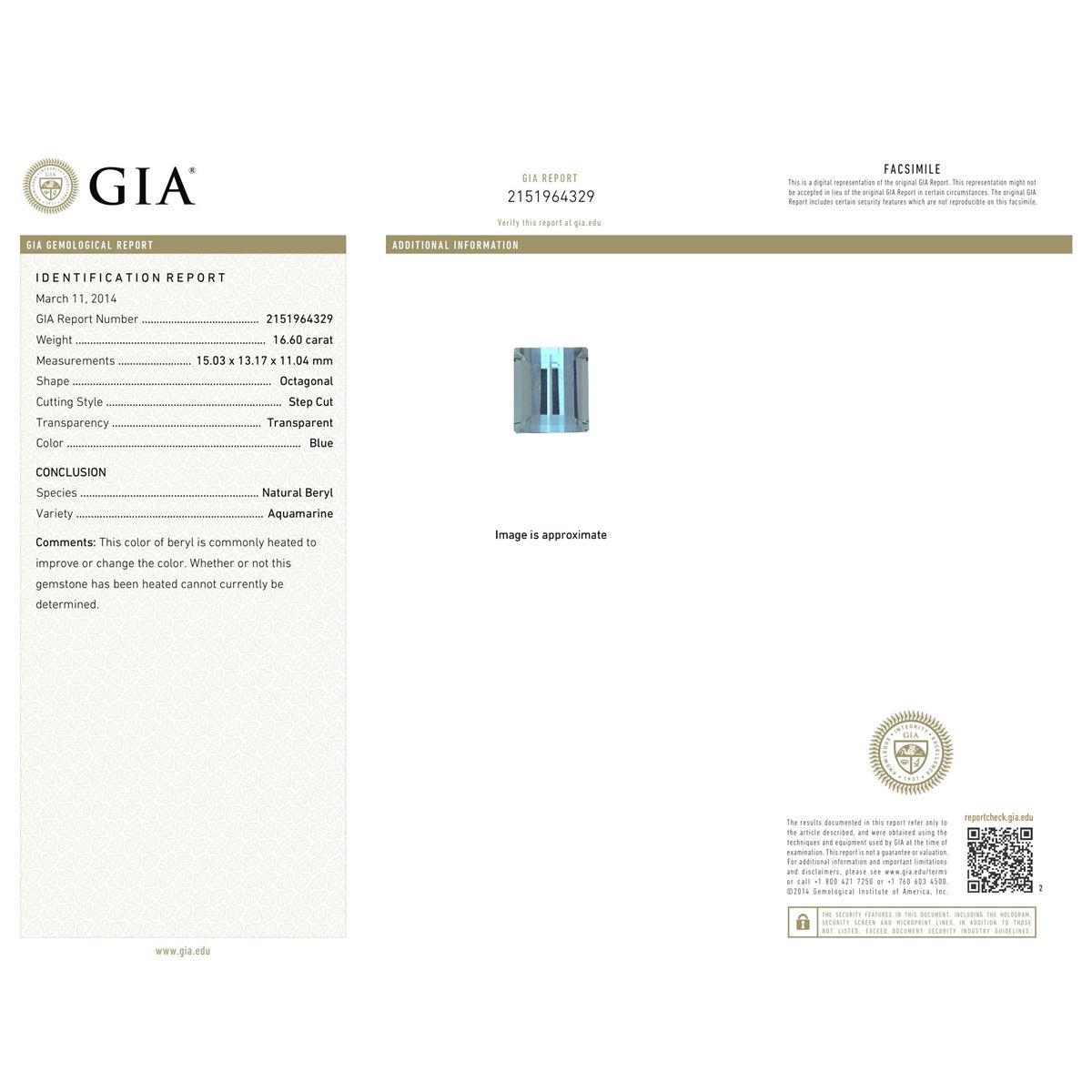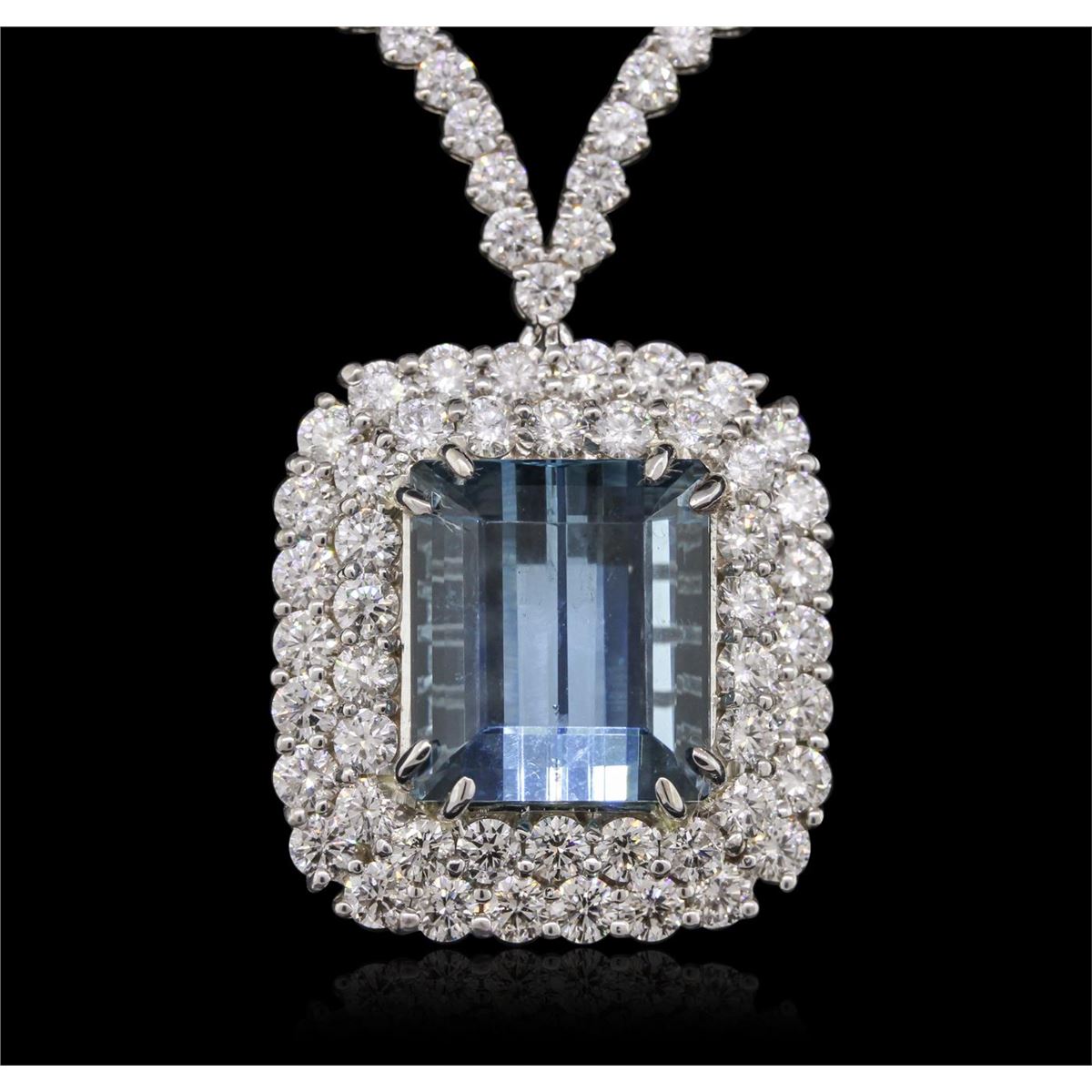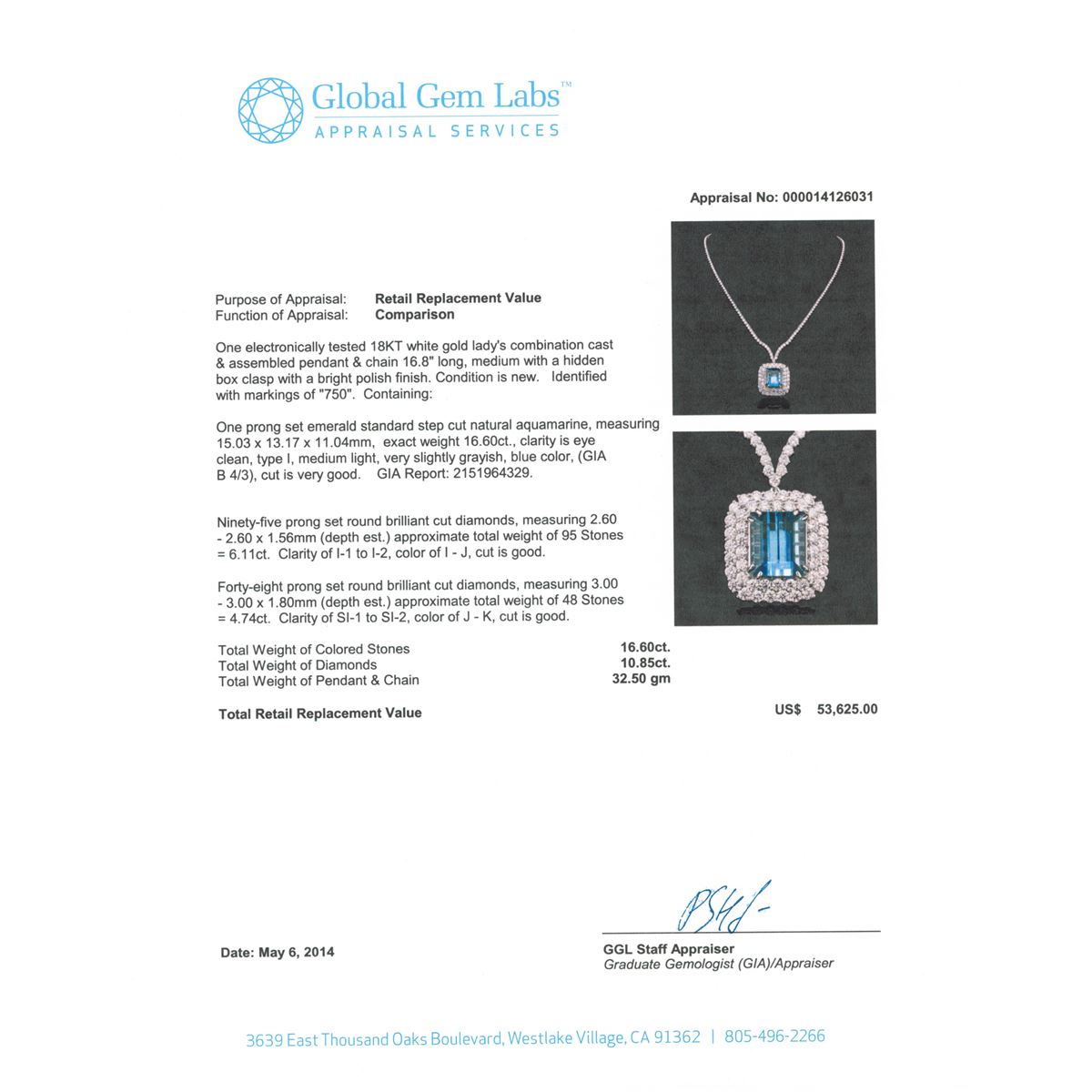 One electronically tested 18KT white gold Ladies combination cast & assembled pendant & chain 16.8 inch long, medium with a hidden box clasp with a bright polish finish. Condition is new. Identified with markings of "750". Containing: One prong set emerald standard step cut natural aquamarine, measuring 15.03 x 13.17 x 11.04mm, exact weight 16.60ct., clarity is eye clean, type I, medium light, very slightly grayish, blue color, (GIA B 4/3), cut is very good. GIA Report: 2151964329. Ninety-Five prong set round brilliant cut diamonds, measuring 2.60 - 2.60 x 1.56mm (depth est.) approximate. Total Weight of 95 Stones = 6.11ct. . Clarity: I-1 to I-2. Color: I - J, Cut is Good. Forty-Eight prong set round brilliant cut diamonds, measuring 3.00 - 3.00 x 1.80mm (depth est.) approximate. Total Weight of 48 Stones = 4.74ct. . Clarity: SI-1 to SI-2. Color: J - K, Cut is Good. Total Weight of Colored Stones 16.60ct. Total Weight of Diamonds 10.85ct. Total Weight of Pendant & Chain 32.50 grams. GGL Appraised at $53,625.00.