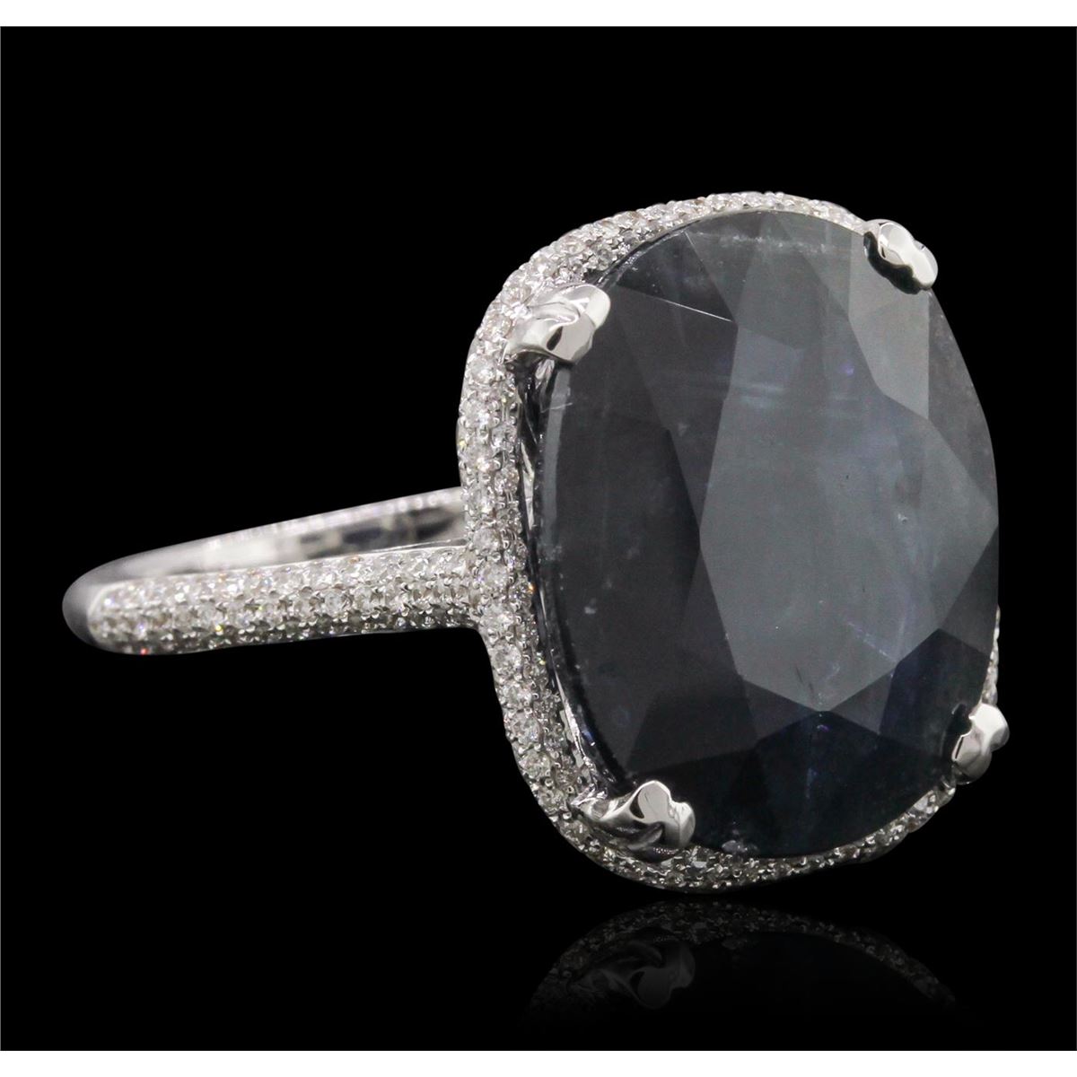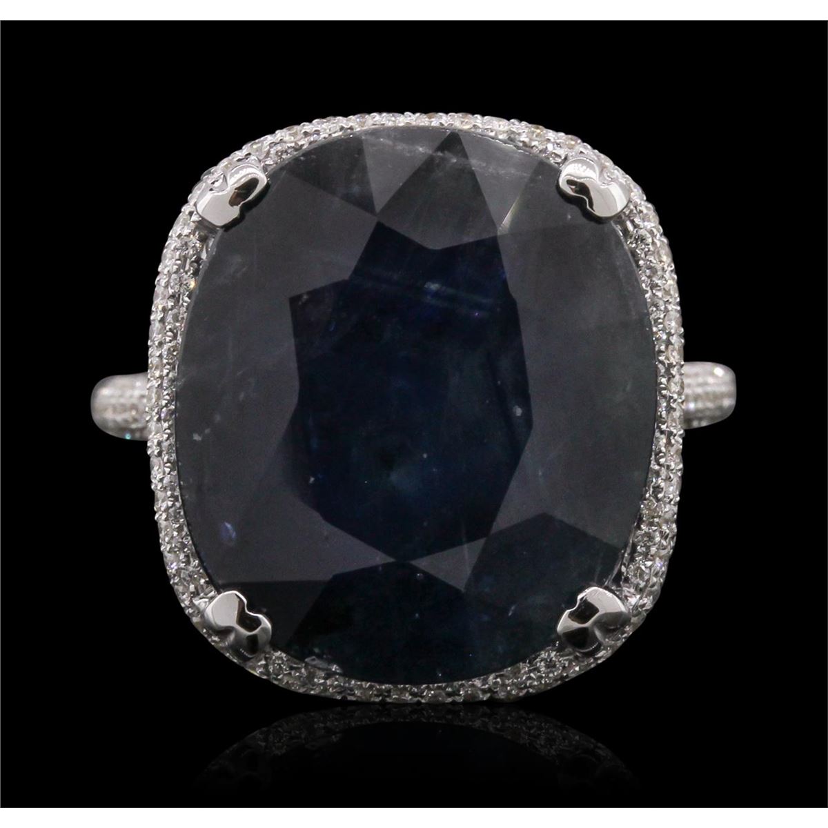 One electronically tested 18KT white gold Ladies combination cast & assembled ring with a bright polish finish. Condition is new. Identified with markings of "18K". Containing: One prong set oval modified mixed cut natural blue sapphire, measuring 17.27 x 14.70 x 8.50mm, approximate weight of 17.38ct., clarity is heavily included, type II, dark, moderately strong, blue color, (GIA B 7/4), cut is good. Colored gemstones are presumed to have been subjected to commonly used color/clarity enhancement processes. Two Hundred Eighty bead set round brilliant cut diamonds, measuring 1.10 - 1.10 x 0.66mm (depth est.) approximate. Total Weight of 280 Stones = 1.34ct. Clarity: I-1 to I-2. Color: H - I, Cut is Good. Total Weight of Colored Stones 17.38ct. Total Weight of Diamonds 1.34ct. Total Weight of Ring 9.20 grams. GGL Appraised at $14,055.00.