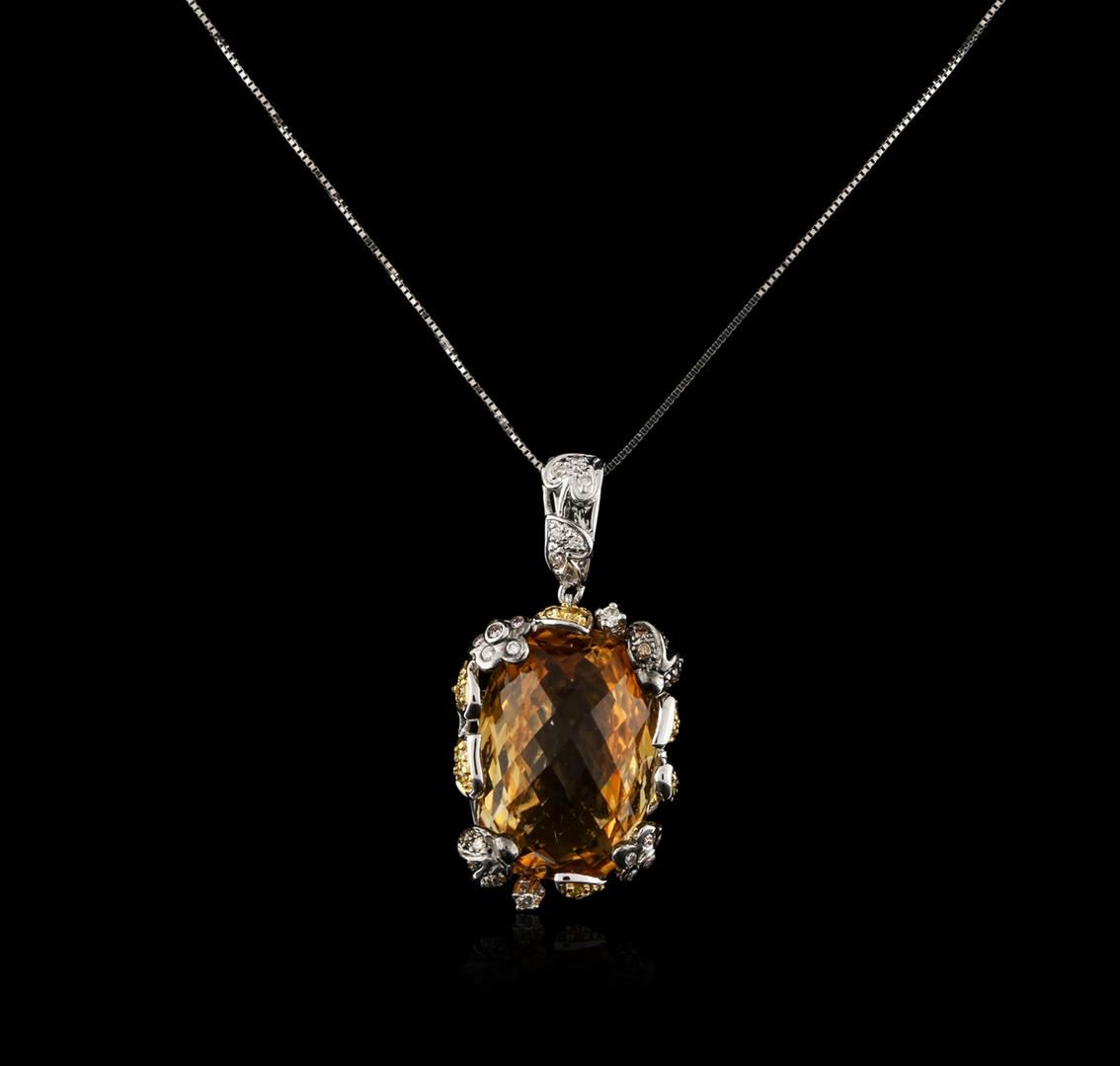 One pendant with chain featuring: 18KT white gold weighing 11.50 grams containing one citrine with a total weight of 18.12ct and diamonds with a total weight of 0.55ct.