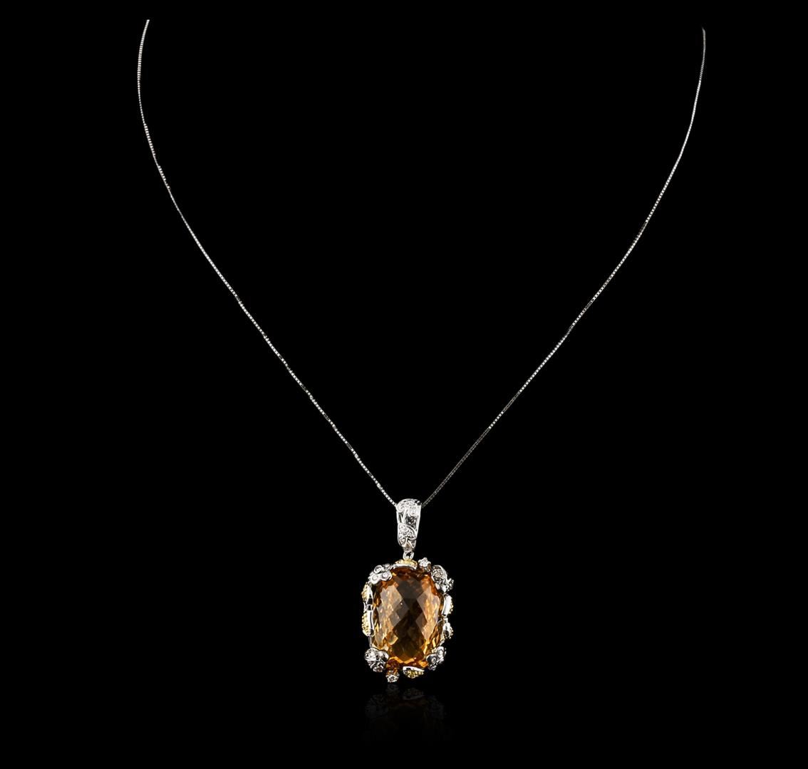 One pendant with chain featuring: 18KT white gold weighing 11.50 grams containing one citrine with a total weight of 18.12ct and diamonds with a total weight of 0.55ct.