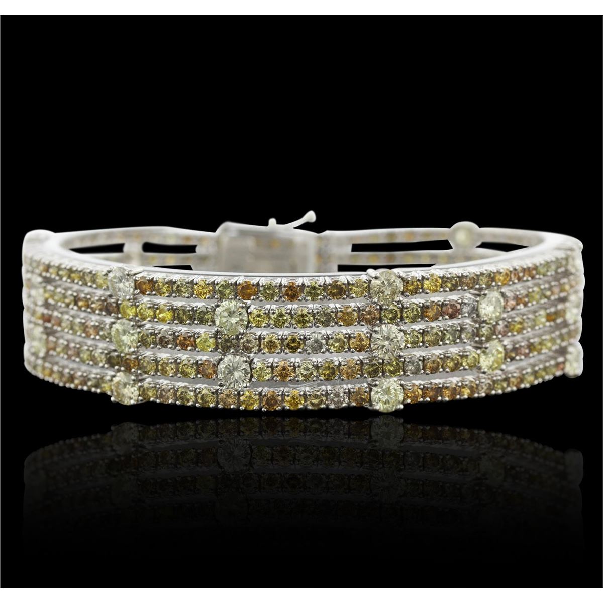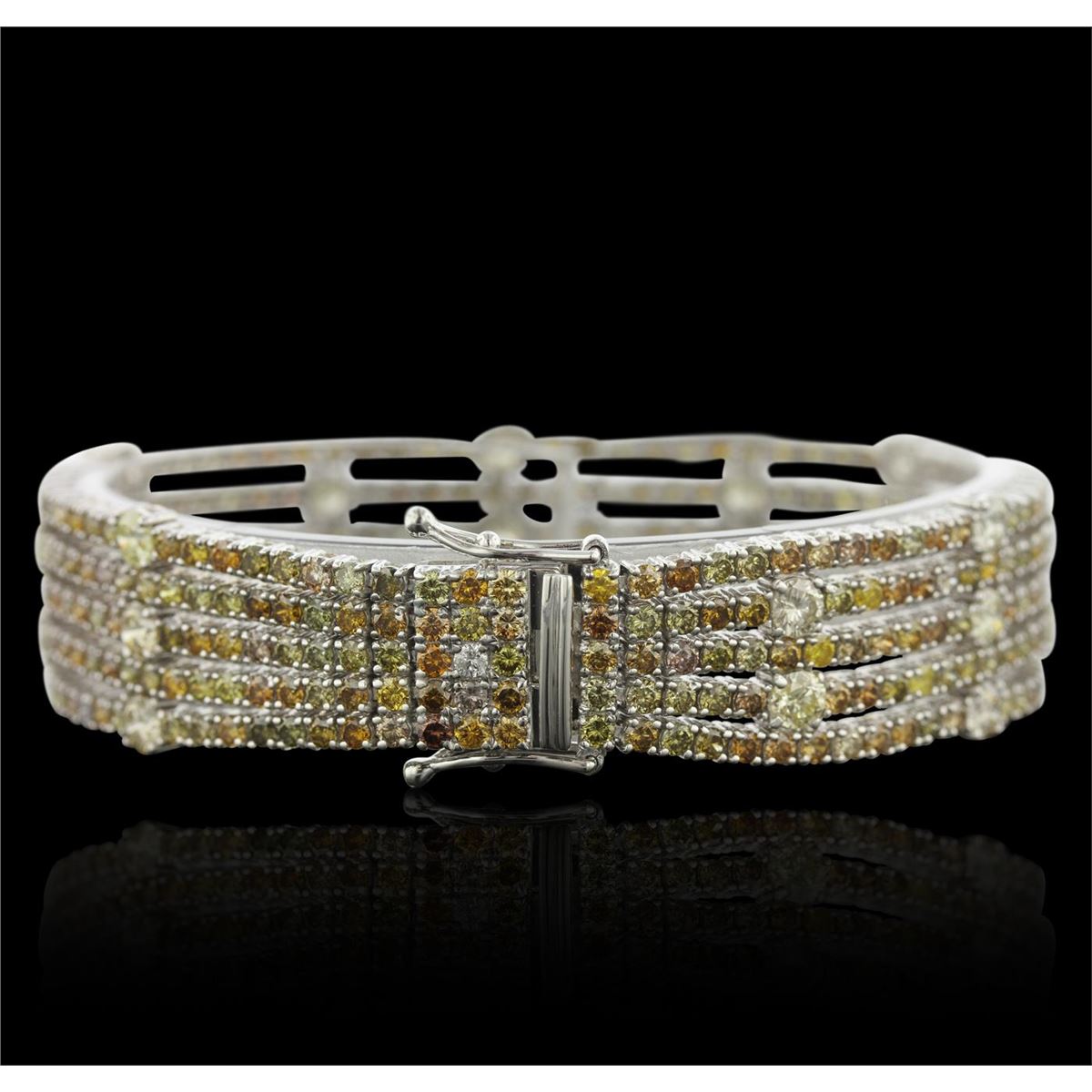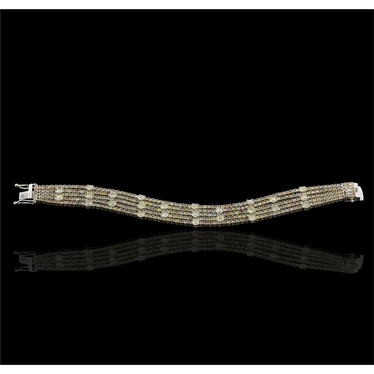 One electronically tested 18KT white gold ladies cast & assembled diamond bracelet with a bright polish finish. Condition is new, good workmanship. Seven inch length bracelet features multiple ribbons of diamonds terminating in a concealed clasp with twin safeties. Identified with markings of "750". Containing: Three hundred sixty-one prong set round brilliant cut diamonds, measuring 3.80 - 2.10 x 1.77mm (depth est.) approximate total weight of 361 Stones = 19.79ct. The group is composed of a mix of natural fancy and irradiated fancy color diamonds ranging from very light yellow to fancy yellow to fancy brown diamonds. Graded in the setting. Clarity SI-2 to I-2. Total Weight of Diamonds: 19.79ct. Total Weight of Bracelet: 37.40gm. US! AIG Appraised at $48,925.00.