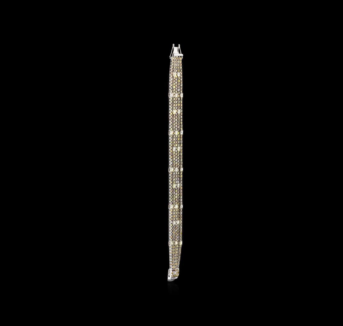 One electronically tested 18KT white gold ladies cast & assembled diamond bracelet with a bright polish finish. Condition is new, good workmanship. Seven inch length bracelet features multiple ribbons of diamonds terminating in a concealed clasp with twin safeties. Identified with markings of "750". Containing: Three hundred sixty-one prong set round brilliant cut diamonds, measuring 3.80 - 2.10 x 1.77mm (depth est.) approximate total weight of 361 Stones = 19.79ct. The group is composed of a mix of natural fancy and irradiated fancy color diamonds ranging from very light yellow to fancy yellow to fancy brown diamonds. Graded in the setting. Clarity SI-2 to I-2. Total Weight of Diamonds: 19.79ct. Total Weight of Bracelet: 37.40gm. US! AIG Appraised at $48,925.00.