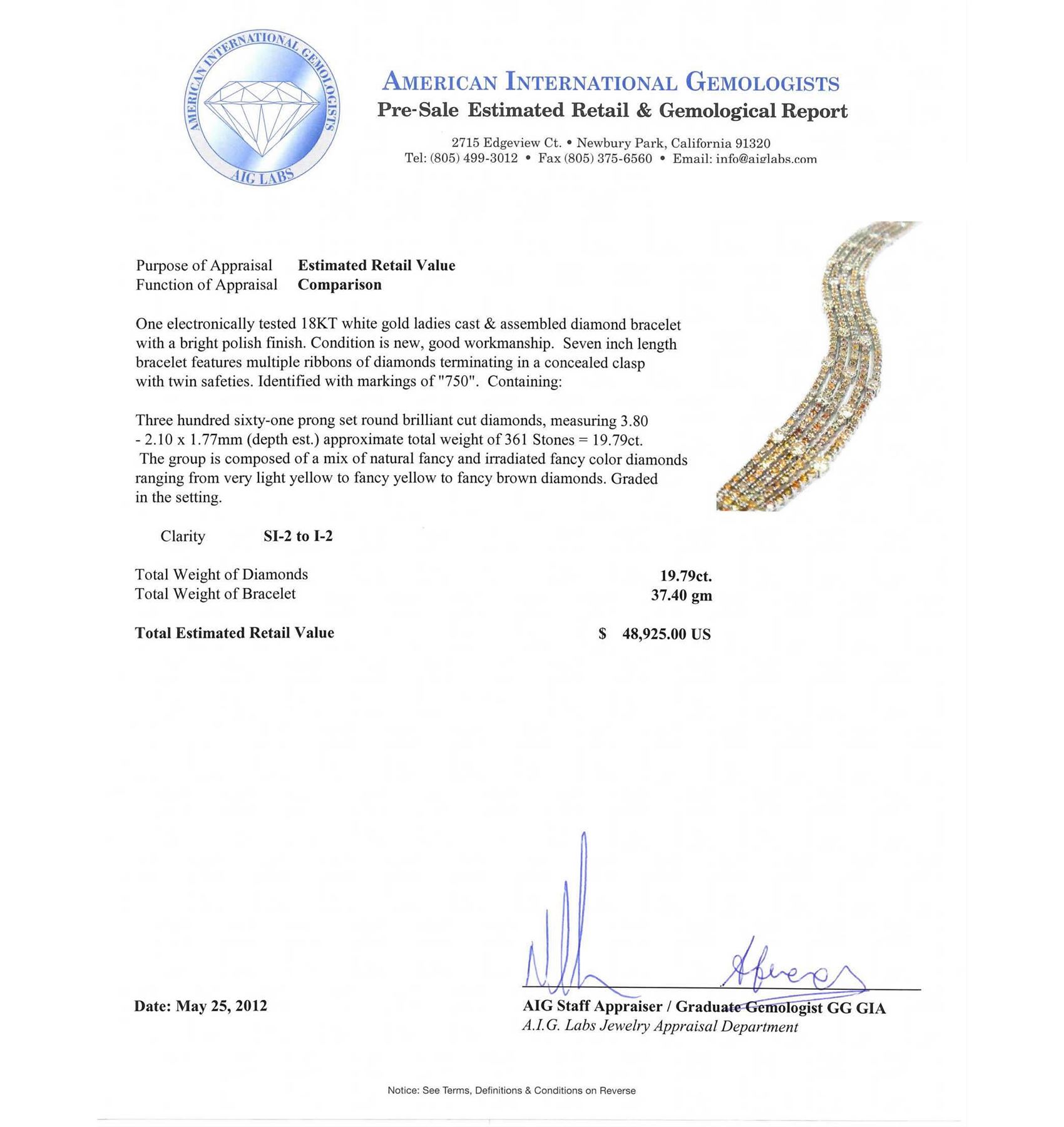 One electronically tested 18KT white gold ladies cast & assembled diamond bracelet with a bright polish finish. Condition is new, good workmanship. Seven inch length bracelet features multiple ribbons of diamonds terminating in a concealed clasp with twin safeties. Identified with markings of "750". Containing: Three hundred sixty-one prong set round brilliant cut diamonds, measuring 3.80 - 2.10 x 1.77mm (depth est.) approximate total weight of 361 Stones = 19.79ct. The group is composed of a mix of natural fancy and irradiated fancy color diamonds ranging from very light yellow to fancy yellow to fancy brown diamonds. Graded in the setting. Clarity SI-2 to I-2. Total Weight of Diamonds: 19.79ct. Total Weight of Bracelet: 37.40gm. US! AIG Appraised at $48,925.00.