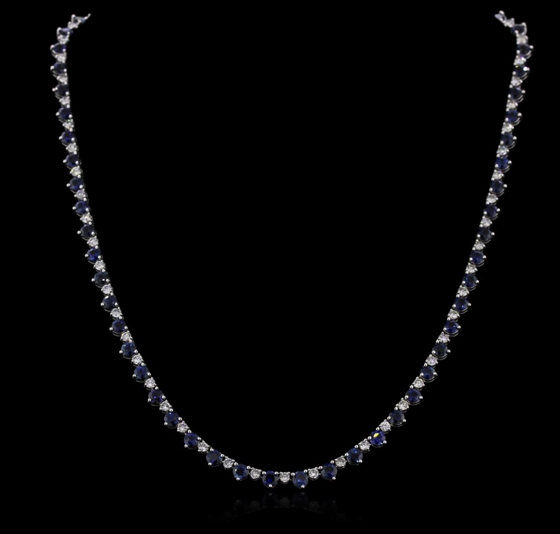 One electronically tested 18KT white gold ladies cast sapphire and diamond necklace with a hidden box clasp with safety closer with a bright polish finish. Measurements: 16.50" in length. Identified with markings of "750". Condition is new. Containing: Sixty prong set round modified brilliant cut natural blue sapphires, measuring 4.00 - 4.00 x 2.60 mm, approximate total weight of 19.80ct., clarity is eye clean, type II, medium, moderately strong, blue color, (GIA B 5/4), cut is very good. Sixty-Two prong set round brilliant cut diamonds, measuring 2.50 - 2.50 x 1.50mm (depth est.) approximate total weight of 62 Stones = 3.54ct. Clarity: I-1. Color: H - I, Cut is Good. Diamonds and colored gemstones are graded in the mounting, unless otherwise stated. Colored gemstones are presumed to have been subjected to commonly used enhancement processes. Total Weight of Colored Stones 19.80ct. Total Weight of Diamonds 3.54ct. Total Weight of Necklace 21.40 grams. GGL Appraised at $12,605.00.