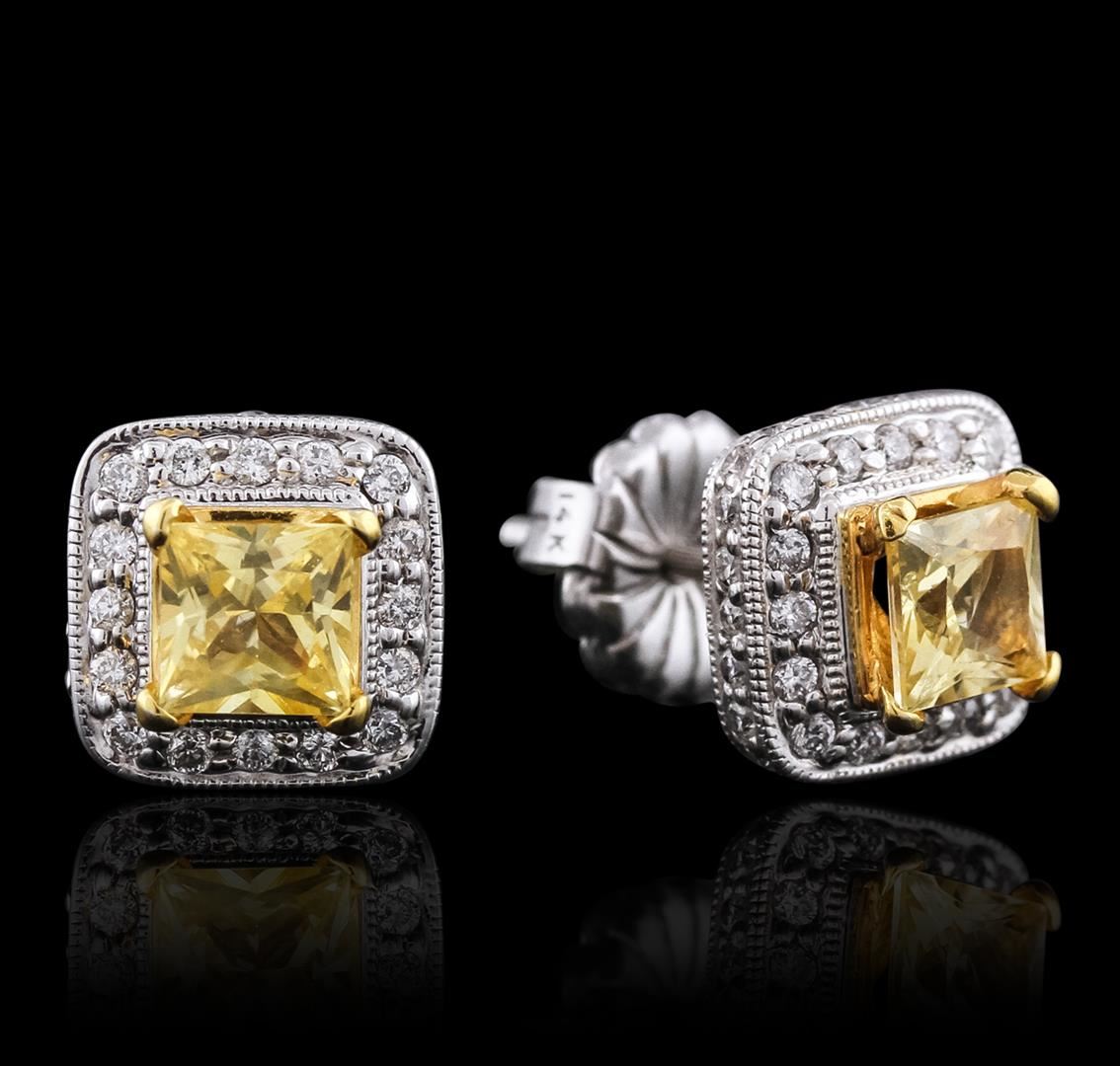 One pair of stud earrings featuring: 18KT White Gold with a total weight of 4.30 grams, Yellow Sapphires with a total weight of 2.00ctw, and Diamonds with a total weight of 0.78ctw.