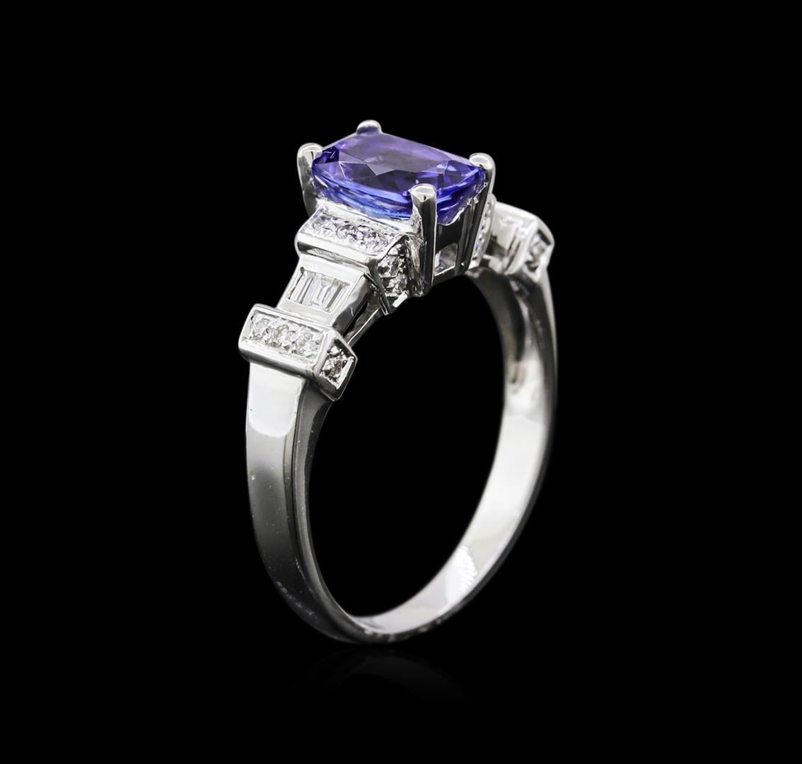 One electronically tested 18KT white gold ladies cast tanzanite and diamond ring with a tapered shank with a bright polish finish. Trademark is 551. Identified with markings of "18K". Condition is new. Containing: One prong set rectangular cushion modified brilliant cut natural tanzanite, measuring 8.05 x 8.06 x 3.93mm, approximate weight of 2.01ct., clarity is eye clean, type I, medium light, very slightly grayish, violet color, (GIA V 4/3), cut is good. Twelve prong set round brilliant cut diamonds, measuring 1.30 - 1.30 x 0.78mm (depth est.) approximate total weight of 12 Stones = 0.10ct. Clarity: SI-2 to I-1. Color: H - I, Cut is Good. Six channel set baguette cut diamonds, measuring 1.50 x 1.00 x 0.85mm (depth est.) approximate total weight of 6 Stones = 0.07ct. Clarity: VS-2. Color: I - J, Cut is Good. All diamonds and colored gemstones are graded in the mounting, unless otherwise stated. Colored gemstones are presumed to have been subjected to commonly used enhancement processes. Total Weight of Colored Stones 2.01ct. Total Weight of Diamonds 0.17ct. Total Weight of Ring 4.40 grams. GGL Appraised at $2,285.00.