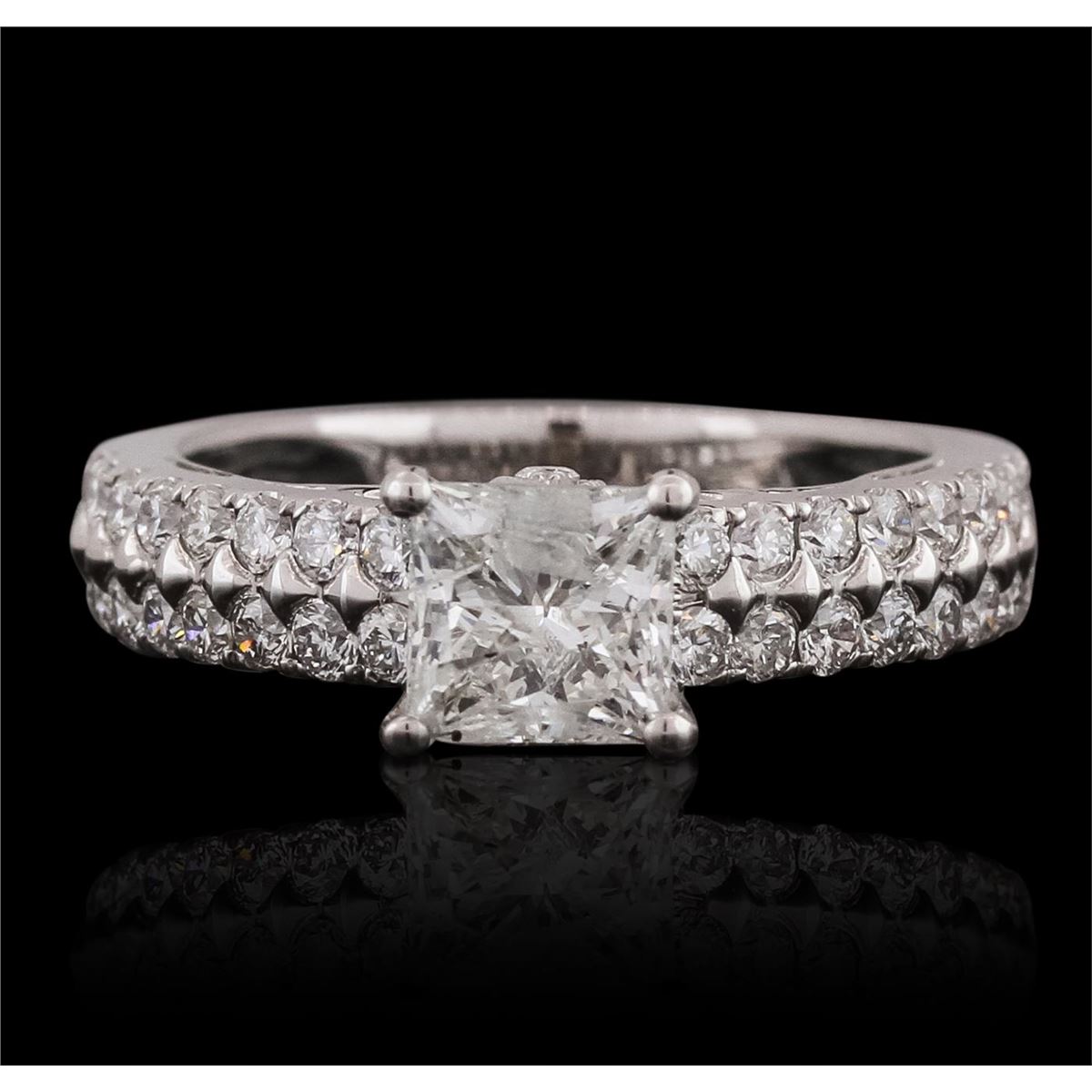 One electronically tested 18KT white gold ladies combination cast & assembled engagement ring with a bright polish finish. Identified with markings of "18K". Condition is new. Containing: One prong set princess cut diamond, measuring 5.75 x 5.63 x 4.22mm (depth est.) approximate weight of 1.12ct. Clarity: I-2. Color: J, Cut is Good. Thirty-Four prong set round brilliant cut diamonds, measuring 1.70 - 1.70 x 1.02mm (depth est.) approximate total weight of 34 Stones = 0.90ct. Clarity: SI-1. Color: I, Cut is Good. All diamonds are graded in the mounting, unless otherwise stated. Total Weight of Diamonds 2.02ct. Total Weight of Ring 5.10 grams. GGL Appraised at $11,755.00.