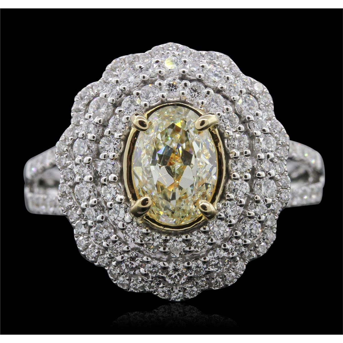 One electronically tested 18KT white gold ladies cast diamond ring. Condition is new, good workmanship. The featured diamond is set within tiered diamond bezels supported by diamond set split shoulders, completed by a two and one-half millimeter wide band. Bright polish finish with yellow gold accents. Trademark is DAYANII. Identified with markings of "18K 750". Containing: One prong set oval shaped cut diamond, measuring 7.75 x 5.40 x 3.45mm (depth est.) approximate weight of 1.02ct. Graded in the setting. Clarity VS-1 Depth 63.9%Table 59.3% One Hundred Twenty-Four prong set round brilliant cut diamonds, measuring 1.50 - 1.00 x 0.75mm (depth est.) approximate total weight of 124 Stones = 1.00ct. Graded in the setting. Clarity VS-1 to SI-1 Color G - I Total Weight of Diamonds 2.02ct. Total Weight of Ring 7.71 grams. AIG Appraised at $14,665.00.