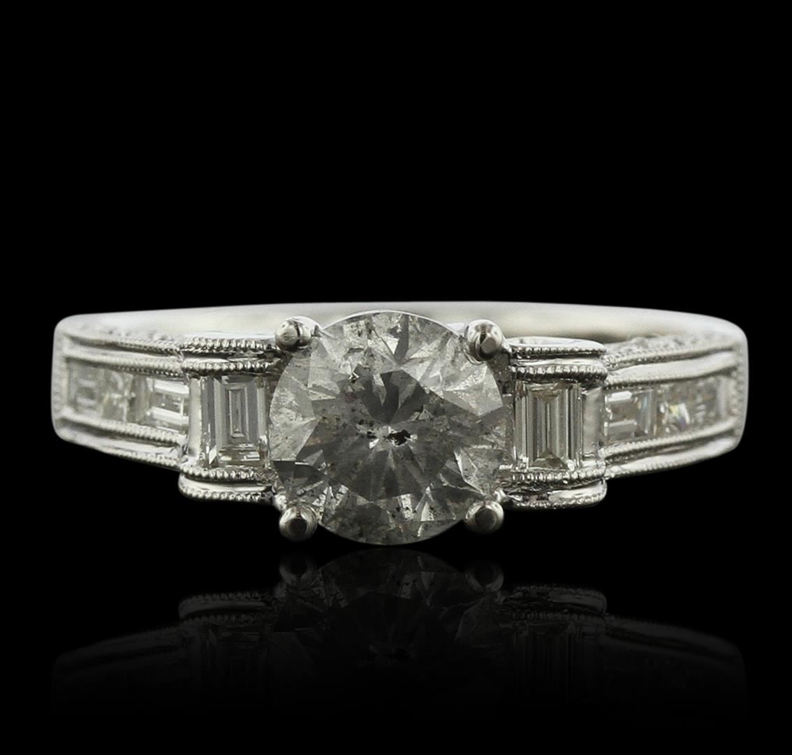 One electronically tested 18KT white gold ladies cast diamond unity ring. The featured diamond is supported by elaborate diamond set shoulders, completed by a two and one-half millimeter wide band. Bright polish finish with milgrain detailing. Identified with markings of "18K". Condition is new, good workmanship. Containing: One prong set round brilliant cut diamond, measuring 6.50 - 6.50 x 4.55mm (depth est.) approximate weight of 1.27ct with a medium blue fluorescence. Graded in the setting. Clarity I-1 Color F Depth 70.0% Table 58.5%. Twenty-Four bead and channel set round brilliant, baguette, and princess cut diamonds approximate total weight of 24 Stones = 0.75ct. Graded in the setting. Clarity VS-1 to SI-1 Color G-H. Total Weight of Diamonds 2.02ct. Total Weight of Ring 4.42 grams. AIG Appraised at $25,285.00.