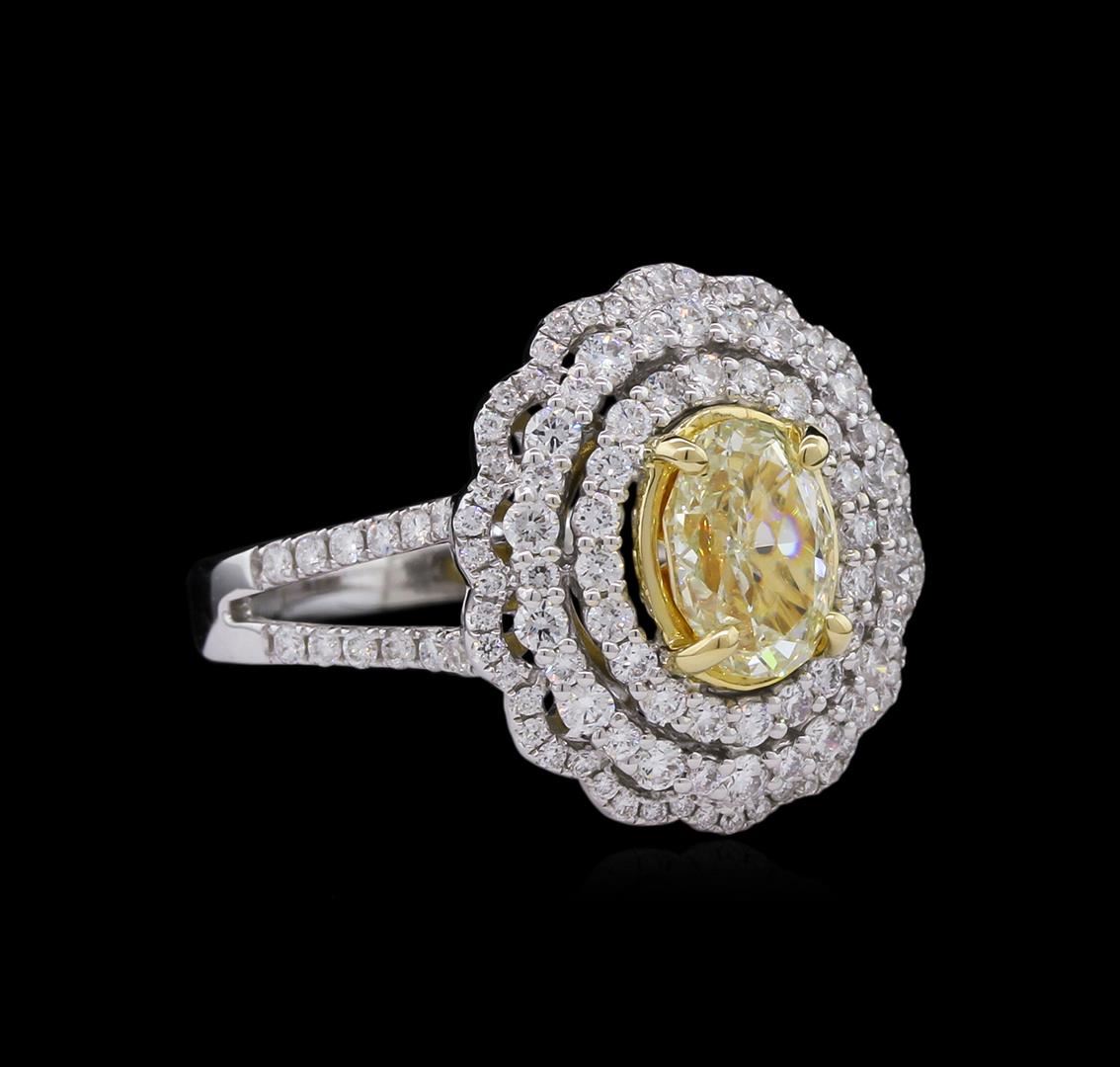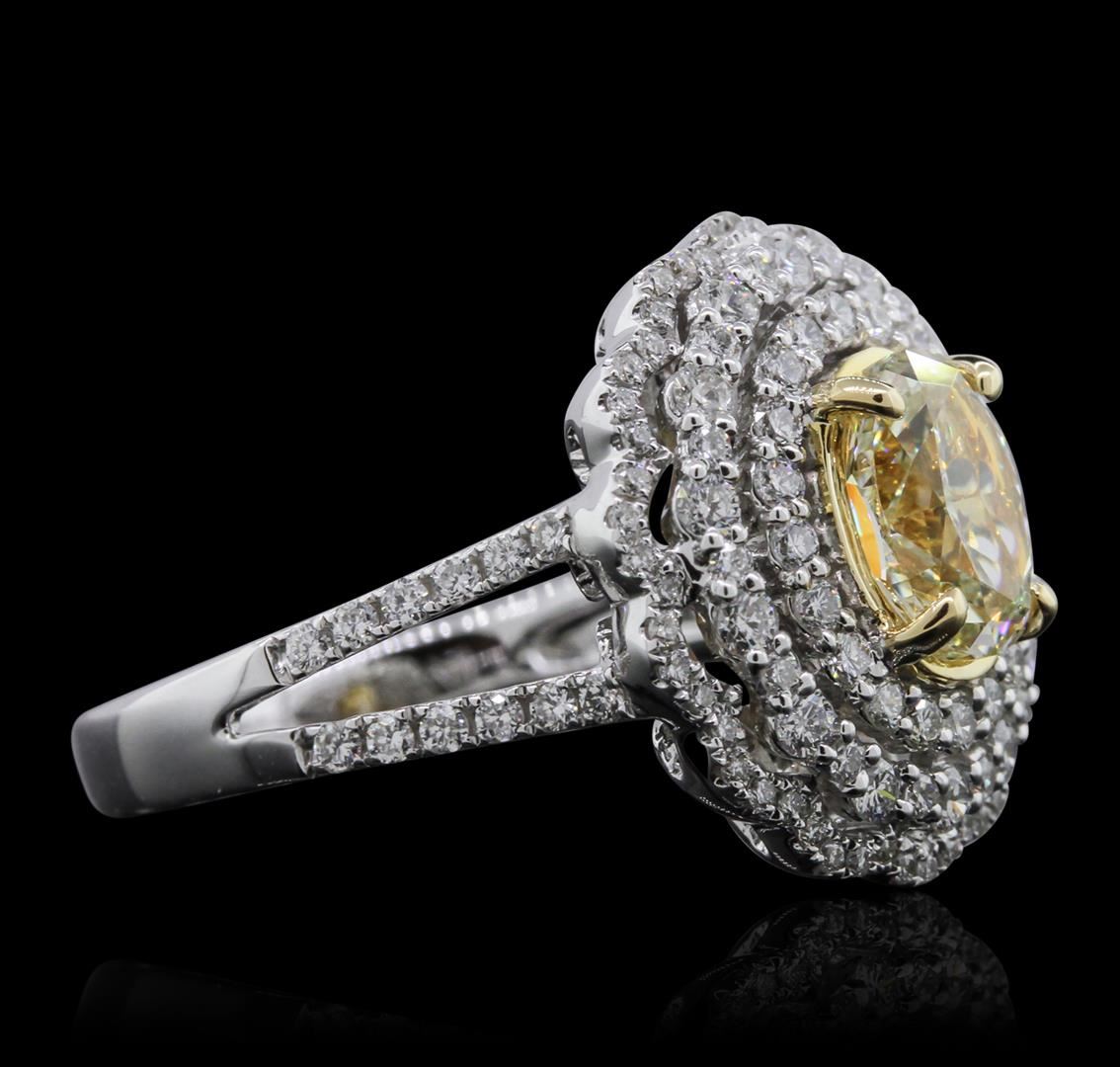 One electronically tested 18KT white gold ladies cast diamond ring. Condition is new, good workmanship. The featured diamond is set within tiered diamond bezels supported by diamond set split shoulders, completed by a two and one-half millimeter wide band. Bright polish finish with yellow gold accents. Trademark is DAYANII. Identified with markings of "18K 750". Containing: One prong set oval shaped cut diamond, measuring 7.75 x 5.40 x 3.45mm (depth est.) approximate weight of 1.02ct. Graded in the setting. Clarity VS-1 Depth 63.9%Table 59.3% One Hundred Twenty-Four prong set round brilliant cut diamonds, measuring 1.50 - 1.00 x 0.75mm (depth est.) approximate total weight of 124 Stones = 1.00ct. Graded in the setting. Clarity VS-1 to SI-1 Color G - I Total Weight of Diamonds 2.02ct. Total Weight of Ring 7.71 grams. AIG Appraised at $14,665.00.