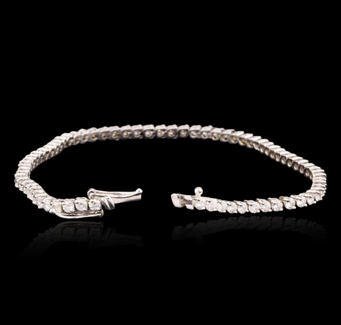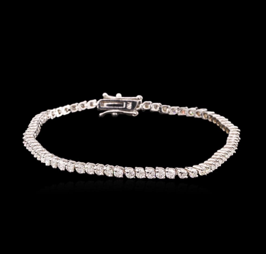 One electronically tested 18KT white gold ladies cast diamond tennis bracelet with a hidden box clasp with a bright polish finish. Measurements: 7" in inch Identified with markings of "750". Condition is new. Containing: Seventy-Three prong set round brilliant cut diamonds, measuring 2.00 - 2.00 x 1.20mm (depth est.) approximate total weight of 73 Stones = 2.13ct. Clarity: SI-1 to SI-2. Color: I - J, Cut is Good. All diamonds are graded in the mounting, unless otherwise stated. Total Weight of Diamonds 2.13ct. Total Weight of Tennis Bracelet 8.90 grams. GGL Appraised at $7,790.00.