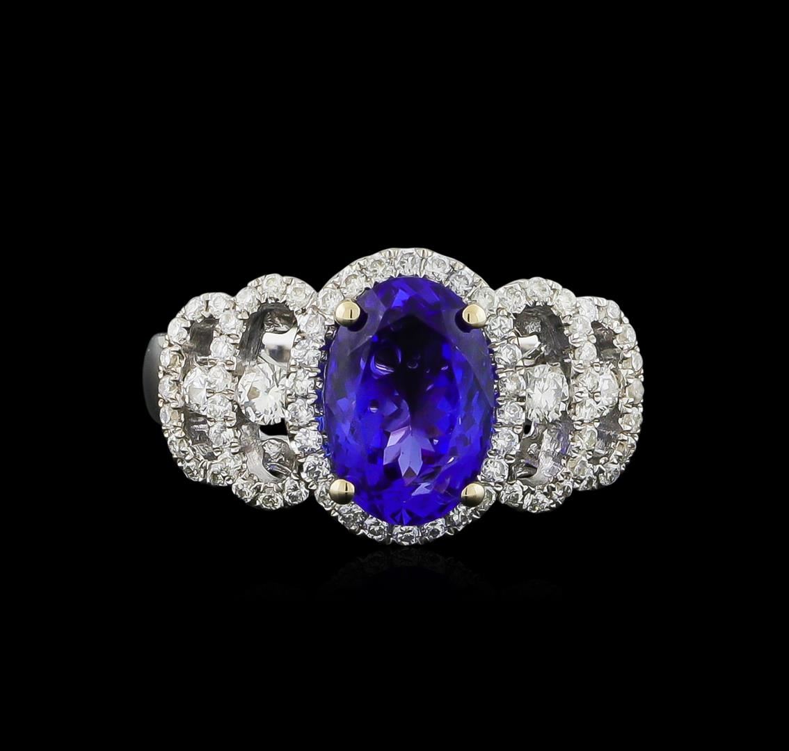 One electronically tested 18KT white gold ladies combination cast & assembled engagement ring with a bright polish finish. Identified with markings of "18K". Condition is new. Containing: One prong set oval modified brilliant cut natural tanzanite, measuring 10.12 x 6.86 x 4.46mm, approximate weight of 2.15ct., clarity is eye clean, type I, medium, moderately strong, violetish blue color, (GIA vB 5/4), cut is good. Four prong set round brilliant cut diamonds, measuring 2.50 - 2.00 x 1.35mm (depth est.) approximate total weight of 4 Stones = 0.17ct. Clarity: SI-1. Color: I - J, Cut is Good. Sixty-Nine prong set round brilliant cut diamonds, measuring 1.10 - 1.10 x 0.66mm (depth est.) approximate total weight of 69 Stones = 0.33ct. Clarity: SI-2 to I-1. Color: H - I, Cut is Good. Colored gemstones are presumed to have been subjected to commonly used enhancement processes. All diamonds and colored gemstones are graded in the mounting, unless otherwise stated. Total Weight of Colored Stones 2.15ct. Total Weight of Diamonds 0.50ct. Total Weight of Ring 7.10 grams. GGL Appraised at $8,355.00.