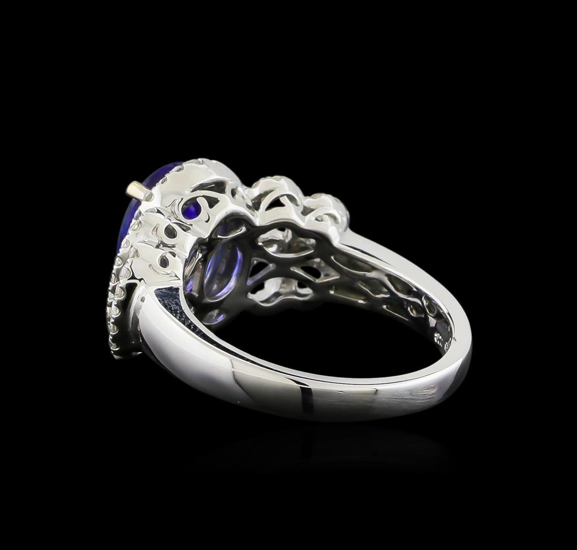 One electronically tested 18KT white gold ladies combination cast & assembled engagement ring with a bright polish finish. Identified with markings of "18K". Condition is new. Containing: One prong set oval modified brilliant cut natural tanzanite, measuring 10.12 x 6.86 x 4.46mm, approximate weight of 2.15ct., clarity is eye clean, type I, medium, moderately strong, violetish blue color, (GIA vB 5/4), cut is good. Four prong set round brilliant cut diamonds, measuring 2.50 - 2.00 x 1.35mm (depth est.) approximate total weight of 4 Stones = 0.17ct. Clarity: SI-1. Color: I - J, Cut is Good. Sixty-Nine prong set round brilliant cut diamonds, measuring 1.10 - 1.10 x 0.66mm (depth est.) approximate total weight of 69 Stones = 0.33ct. Clarity: SI-2 to I-1. Color: H - I, Cut is Good. Colored gemstones are presumed to have been subjected to commonly used enhancement processes. All diamonds and colored gemstones are graded in the mounting, unless otherwise stated. Total Weight of Colored Stones 2.15ct. Total Weight of Diamonds 0.50ct. Total Weight of Ring 7.10 grams. GGL Appraised at $8,355.00.