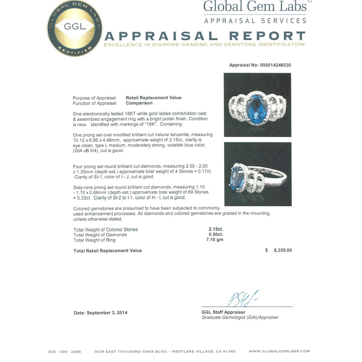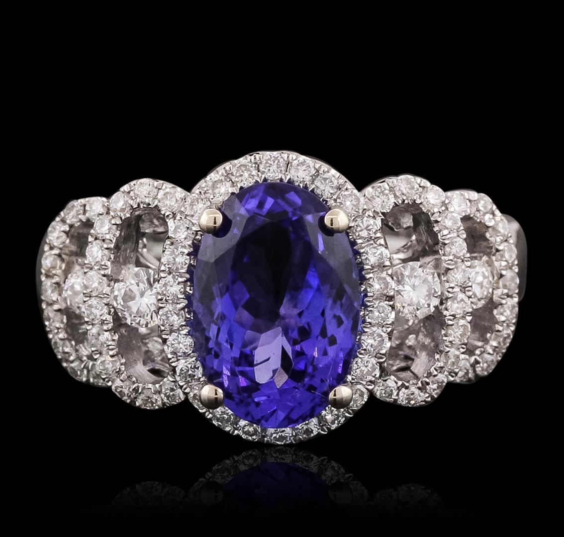 One electronically tested 18KT white gold ladies combination cast & assembled engagement ring with a bright polish finish. Identified with markings of "18K". Condition is new. Containing: One prong set oval modified brilliant cut natural tanzanite, measuring 10.12 x 6.86 x 4.46mm, approximate weight of 2.15ct., clarity is eye clean, type I, medium, moderately strong, violetish blue color, (GIA vB 5/4), cut is good. Four prong set round brilliant cut diamonds, measuring 2.50 - 2.00 x 1.35mm (depth est.) approximate total weight of 4 Stones = 0.17ct. Clarity: SI-1. Color: I - J, Cut is Good. Sixty-Nine prong set round brilliant cut diamonds, measuring 1.10 - 1.10 x 0.66mm (depth est.) approximate total weight of 69 Stones = 0.33ct. Clarity: SI-2 to I-1. Color: H - I, Cut is Good. Colored gemstones are presumed to have been subjected to commonly used enhancement processes. All diamonds and colored gemstones are graded in the mounting, unless otherwise stated. Total Weight of Colored Stones 2.15ct. Total Weight of Diamonds 0.50ct. Total Weight of Ring 7.10 grams. GGL Appraised at $8,355.00.