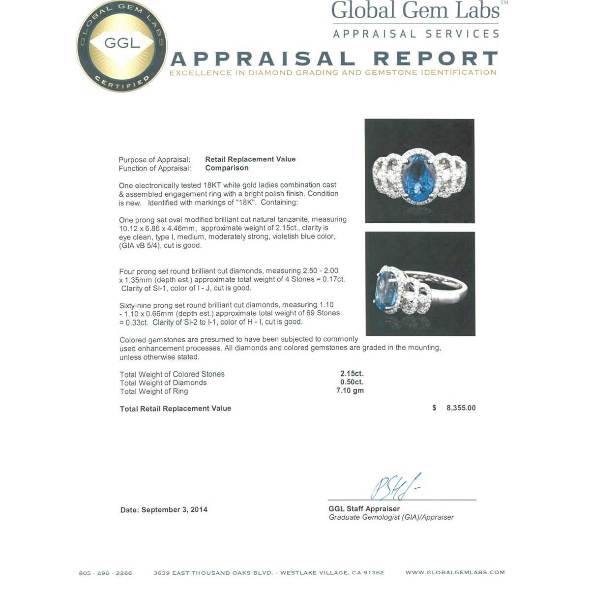 One electronically tested 18KT white gold ladies combination cast & assembled engagement ring with a bright polish finish. Identified with markings of "18K". Condition is new. Containing: One prong set oval modified brilliant cut natural tanzanite, measuring 10.12 x 6.86 x 4.46mm, approximate weight of 2.15ct., clarity is eye clean, type I, medium, moderately strong, violetish blue color, (GIA vB 5/4), cut is good. Four prong set round brilliant cut diamonds, measuring 2.50 - 2.00 x 1.35mm (depth est.) approximate total weight of 4 Stones = 0.17ct. Clarity: SI-1. Color: I - J, Cut is Good. Sixty-Nine prong set round brilliant cut diamonds, measuring 1.10 - 1.10 x 0.66mm (depth est.) approximate total weight of 69 Stones = 0.33ct. Clarity: SI-2 to I-1. Color: H - I, Cut is Good. Colored gemstones are presumed to have been subjected to commonly used enhancement processes. All diamonds and colored gemstones are graded in the mounting, unless otherwise stated. Total Weight of Colored Stones 2.15ct. Total Weight of Diamonds 0.50ct. Total Weight of Ring 7.10 grams. GGL Appraised at $8,355.00.