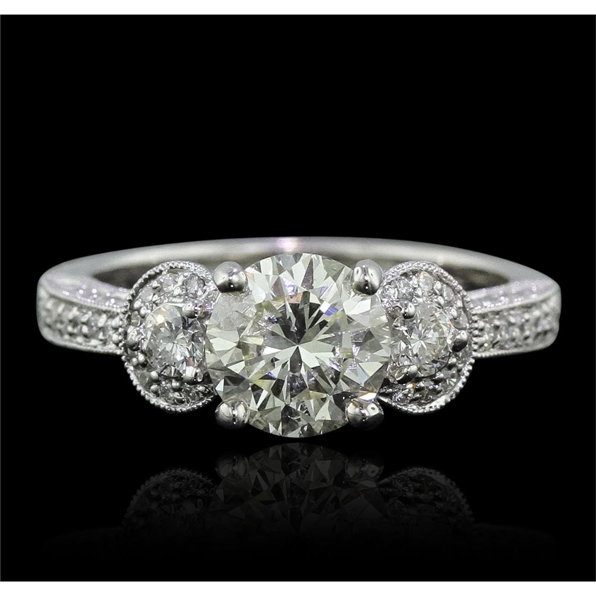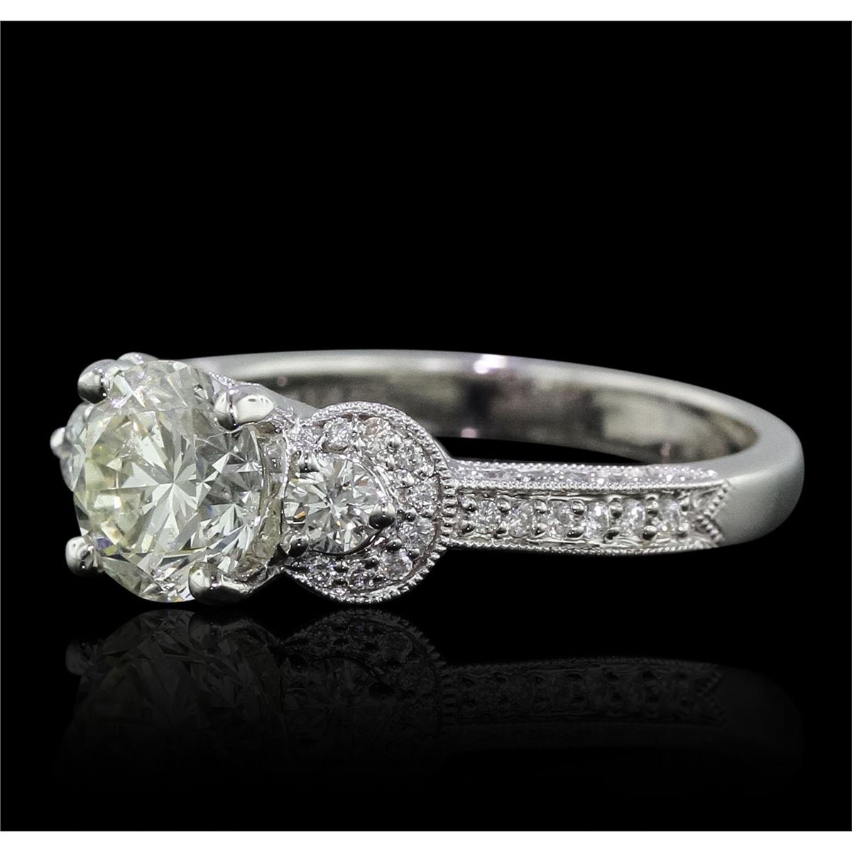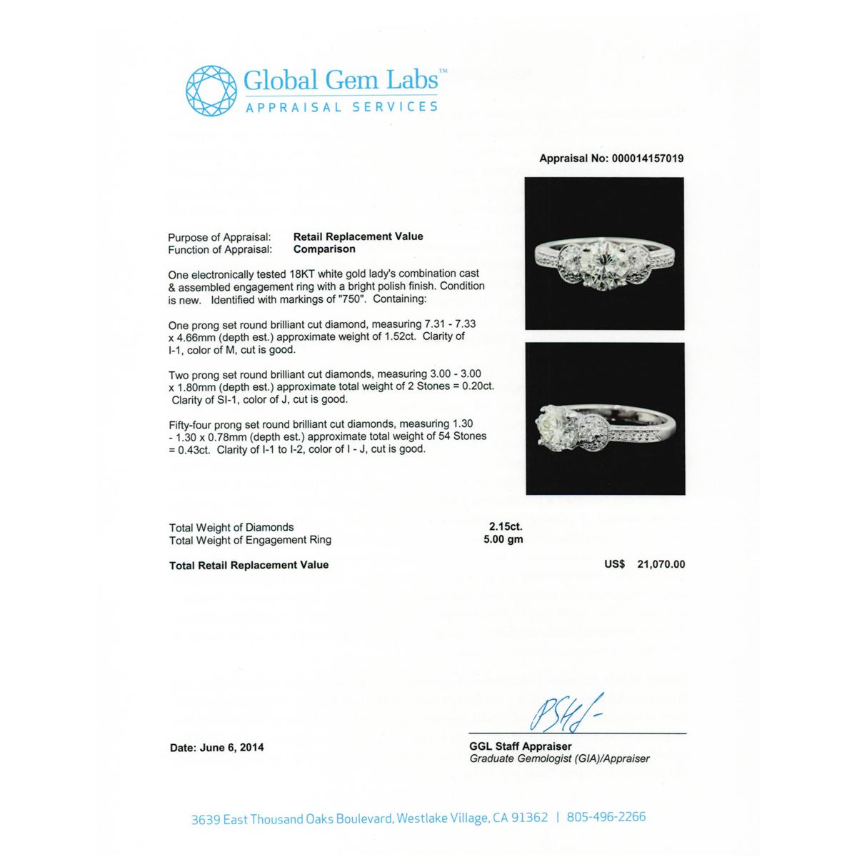 One electronically tested 18KT white gold Ladies combination cast & assembled engagement ring with a bright polish finish. Condition is new. Identified with markings of "750". Containing: One prong set round brilliant cut diamond, measuring 7.31 - 7.33 x 4.66mm (depth est.) approximate weight of 1.52ct. Clarity: I-1. Color: M, Cut is Good. Two prong set round brilliant cut diamonds, measuring 3.00 - 3.00 x 1.80mm (depth est.) approximate. Total Weight of 2 Stones = 0.20ct. Clarity: SI-1. Color: J, Cut is Good. Fifty-Four prong set round brilliant cut diamonds, measuring 1.30 - 1.30 x 0.78mm (depth est.) approximate. Total Weight of 54 Stones = 0.43ct. Clarity: I-1 to I-2. Color: I - J, Cut is Good. Total Weight of Diamonds 2.15ct. Total Weight of Engagement Ring 5.00 grams. GGL Appraised at $21,070.00.