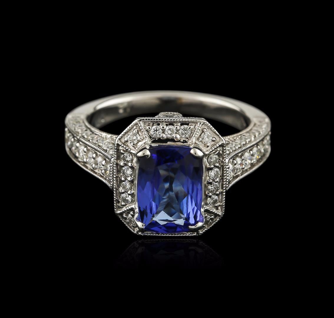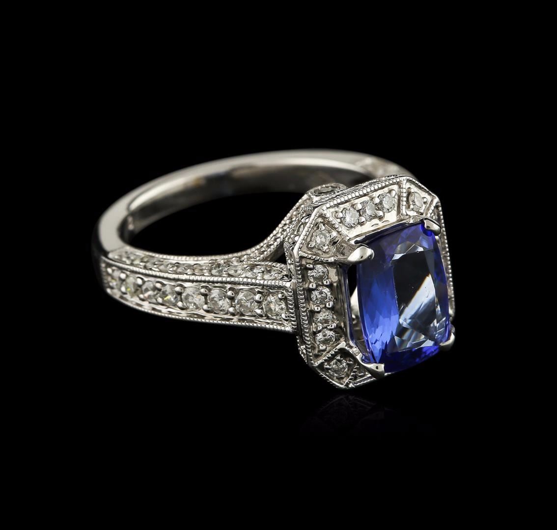 One electronically tested 18KT white gold ladies cast tanzanite and diamond ring with a bright polish finish. Identified with markings of "750". Condition is new. Containing: One prong set rectangular cushion modified brilliant cut natural tanzanite, measuring 9.20 x 6.80 x 4.42mm, approximate weight of 2.18ct., clarity is eye clean, type I, medium light, very slightly grayish, violet color, (GIA V 4/3), cut is good. Eighty-Six prong set round brilliant cut diamonds, measuring 1.50 - 1.30 x 0.84mm (depth est.) approximate total weight of 86 Stones = 0.86ct. Clarity: SI-2 to I-1. Color: H - I, Cut is Good. Diamonds and colored gemstones are graded in the mounting, unless otherwise stated. Colored gemstones are presumed to have been subjected to commonly used enhancement processes. Total Weight of Colored Stones 2.18ct. Total Weight of Diamonds 0.86ct. Total Weight of Ring 6.70 grams. GGL Appraised at $4,285.00.