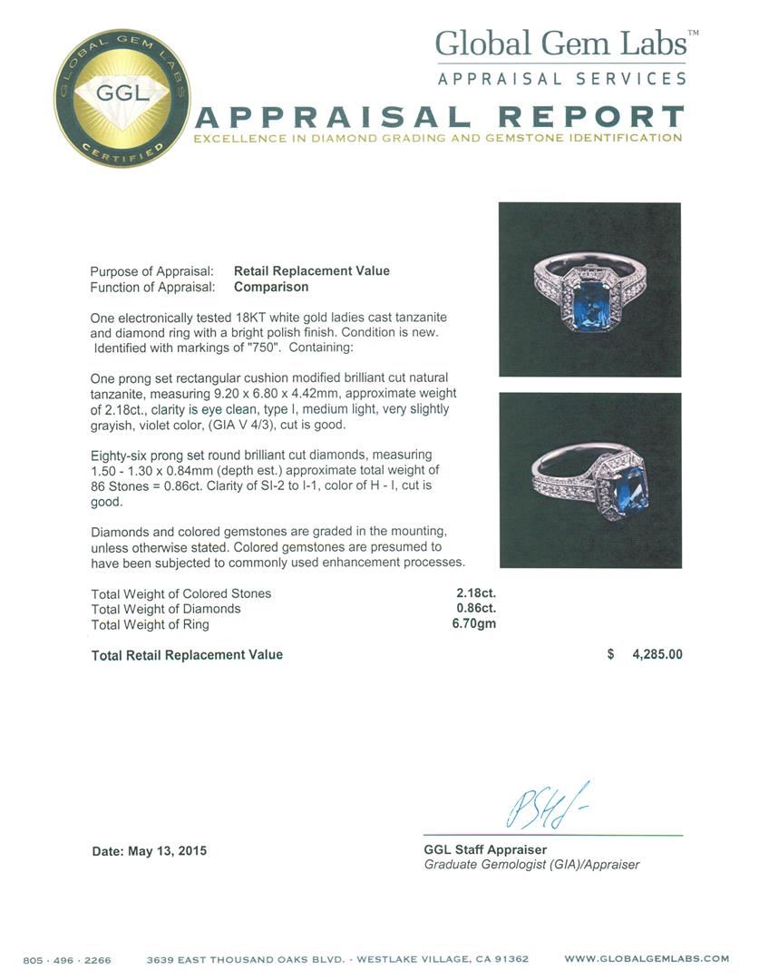 One electronically tested 18KT white gold ladies cast tanzanite and diamond ring with a bright polish finish. Identified with markings of "750". Condition is new. Containing: One prong set rectangular cushion modified brilliant cut natural tanzanite, measuring 9.20 x 6.80 x 4.42mm, approximate weight of 2.18ct., clarity is eye clean, type I, medium light, very slightly grayish, violet color, (GIA V 4/3), cut is good. Eighty-Six prong set round brilliant cut diamonds, measuring 1.50 - 1.30 x 0.84mm (depth est.) approximate total weight of 86 Stones = 0.86ct. Clarity: SI-2 to I-1. Color: H - I, Cut is Good. Diamonds and colored gemstones are graded in the mounting, unless otherwise stated. Colored gemstones are presumed to have been subjected to commonly used enhancement processes. Total Weight of Colored Stones 2.18ct. Total Weight of Diamonds 0.86ct. Total Weight of Ring 6.70 grams. GGL Appraised at $4,285.00.