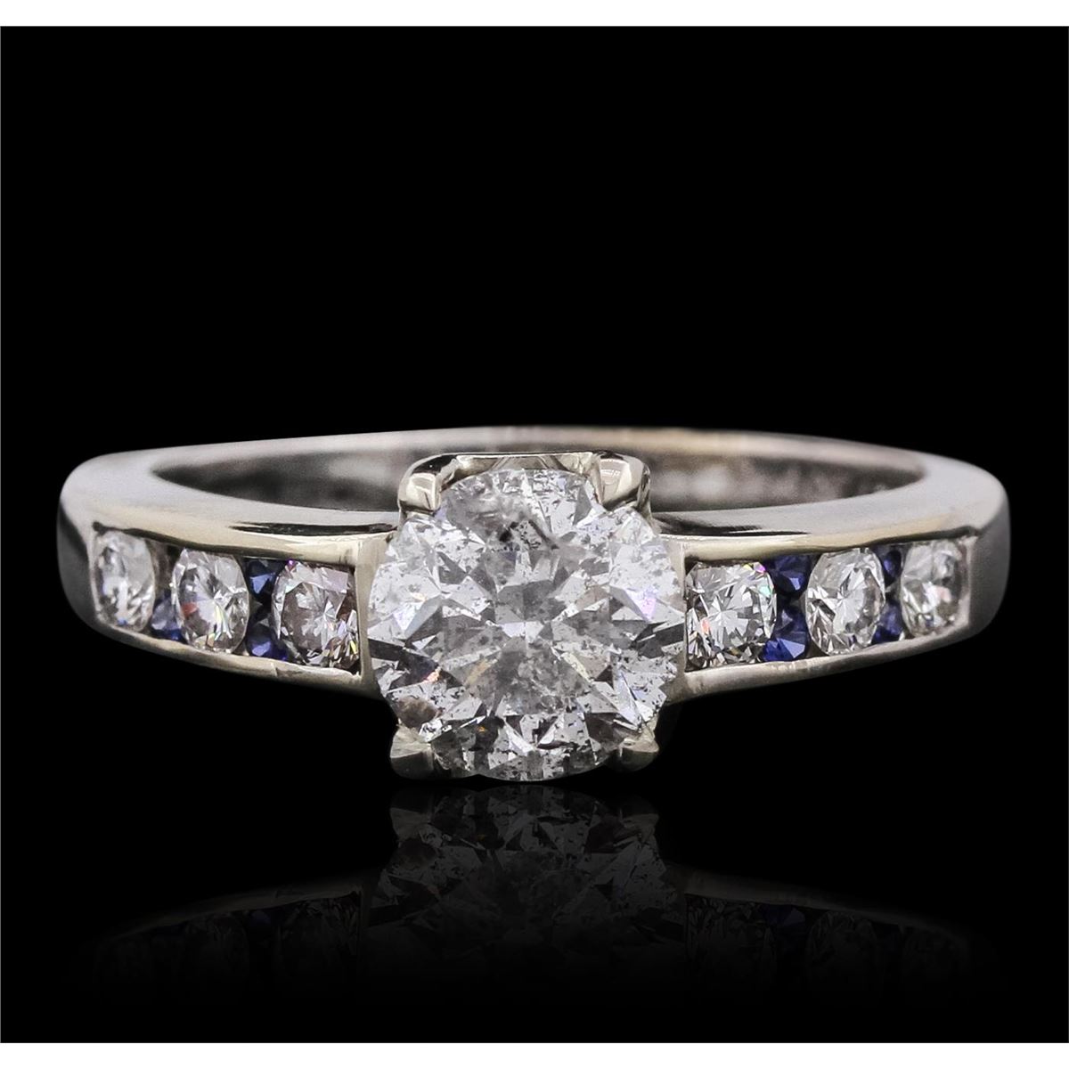One electronically tested 18KT white gold ladies cast diamond and sapphire ring with a bright polish finish. The featured diamond is supported by diamond and sapphire set shoulders, completed by a two millimeter wide band. Identified with markings of "18K". Condition is good. Containing: One prong set round brilliant cut diamond, measuring 7.10 - 7.08 x 4.70mm (depth est.), 4.00.%. GTCF approximate weight of 1.59ct with a medium blue fluorescence. Naturally occurring internal & external characteristics are present, including natural iridescence. Graded in the setting. Clarity: I-2 . Color: I. Depth 66.3%. Table 56.4%. Six channel set round brilliant cut diamonds, measuring 2.90 - 2.80 x 1.71mm (depth est.) approximate total weight of 6 Stones = 0.60ct. Graded in the setting. Clarity: VVS-1 to VVS-2. Color G - I. Eight channel set round brilliant cut natural blue sapphires, measuring 1.40 - 1.30 x 0.88 mm, approximate total weight of 0.15ct., clarity is eye clean, type II, medium dark, moderately strong, blue color, (GIA B 6/4), cut is good. Transmitting light with no distortion, transparent. Color grade is an average for the group. Graded in the setting. Total Weight of Colored Stones 0.15ct. Total Weight of Diamonds 2.19ct. Total Weight of Ring 5.31 grams. AIG Appraised at $19,335.00.