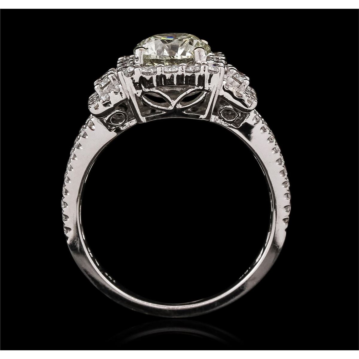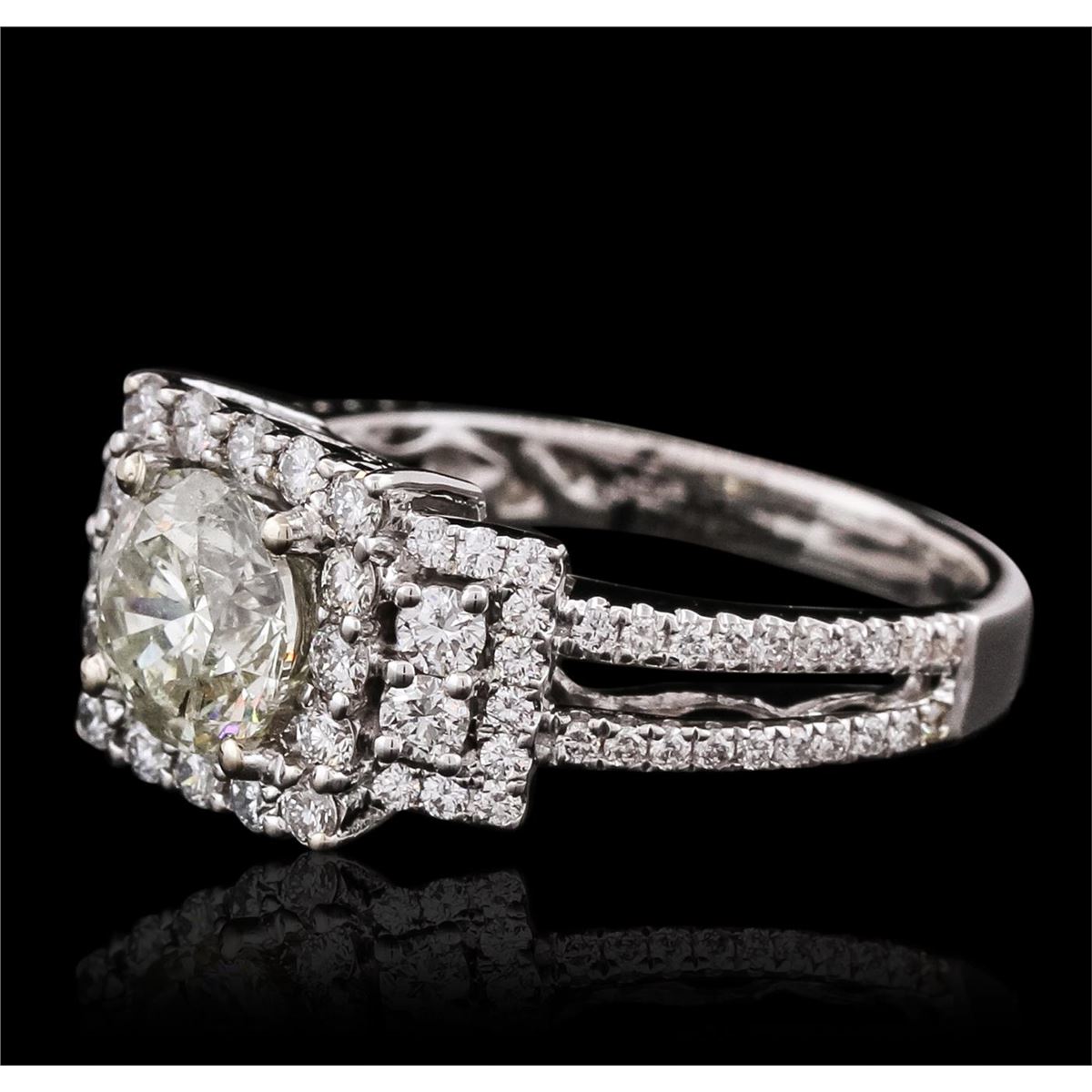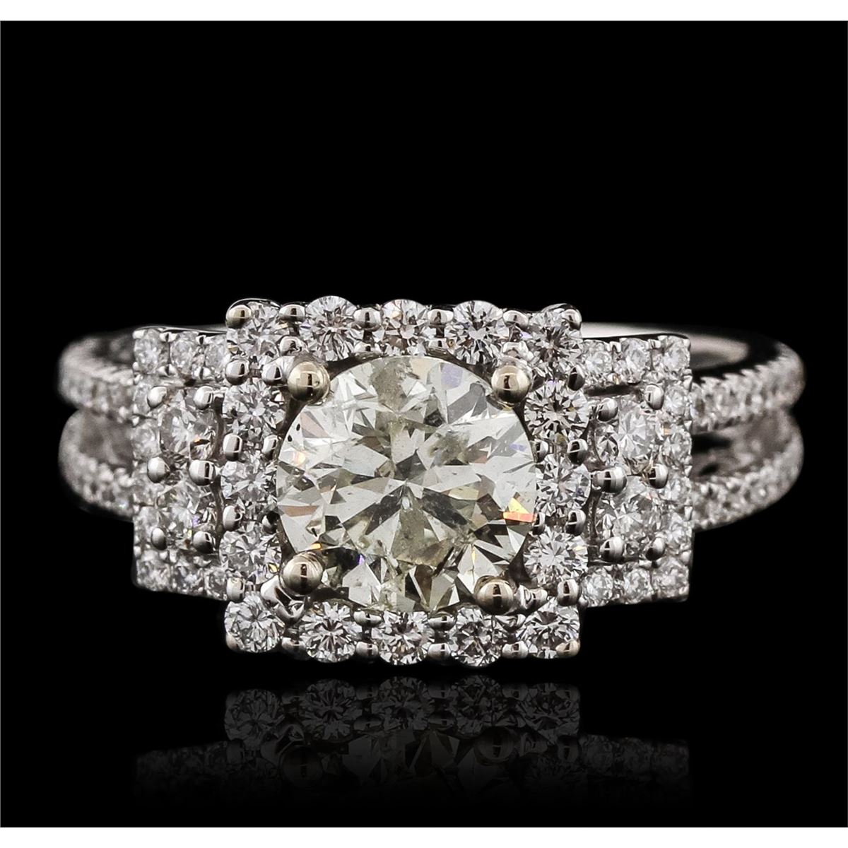 One electronically tested 18KT White Gold ladies cast diamond unity ring with a bright polish finish. The featured diamond is set within a diamond bezel supported by elaborate diamond set split shoulders, completed by a two and one-half millimeter wide band. Identified with markings of "18K 750". Condition is new, good workmanship. Containing: One prong set round brilliant cut diamond, measuring 6.85 - 6.80 x 4.45mm (depth est.) approximate weight of 1.36ct with a strong blue fluorescence. Graded in the setting. Clarity: I-1. Color: M. Depth 65.3%. Table 58.7%. Eighty prong set round brilliant cut diamonds approximate total weight of 80 Stones = 0.83ct. Graded in the setting. Clarity: VS-1 to SI-1. Color: G - I. Total Weight of Diamonds 2.19ct. Total Weight of Unity Ring 5.52 grams. AIG Appraised at $17,610.00.